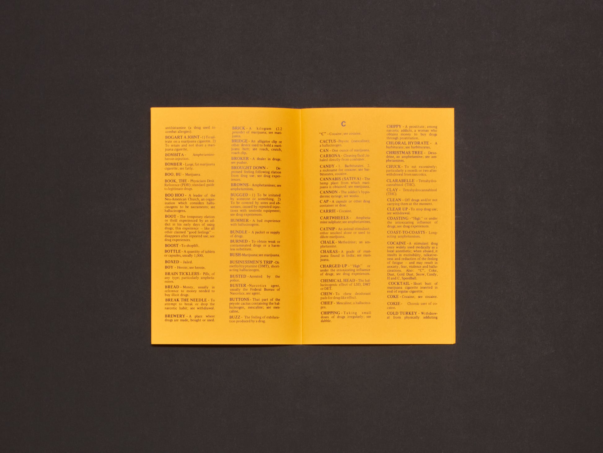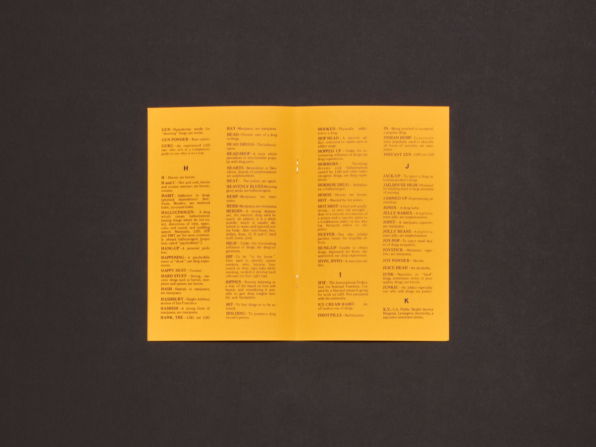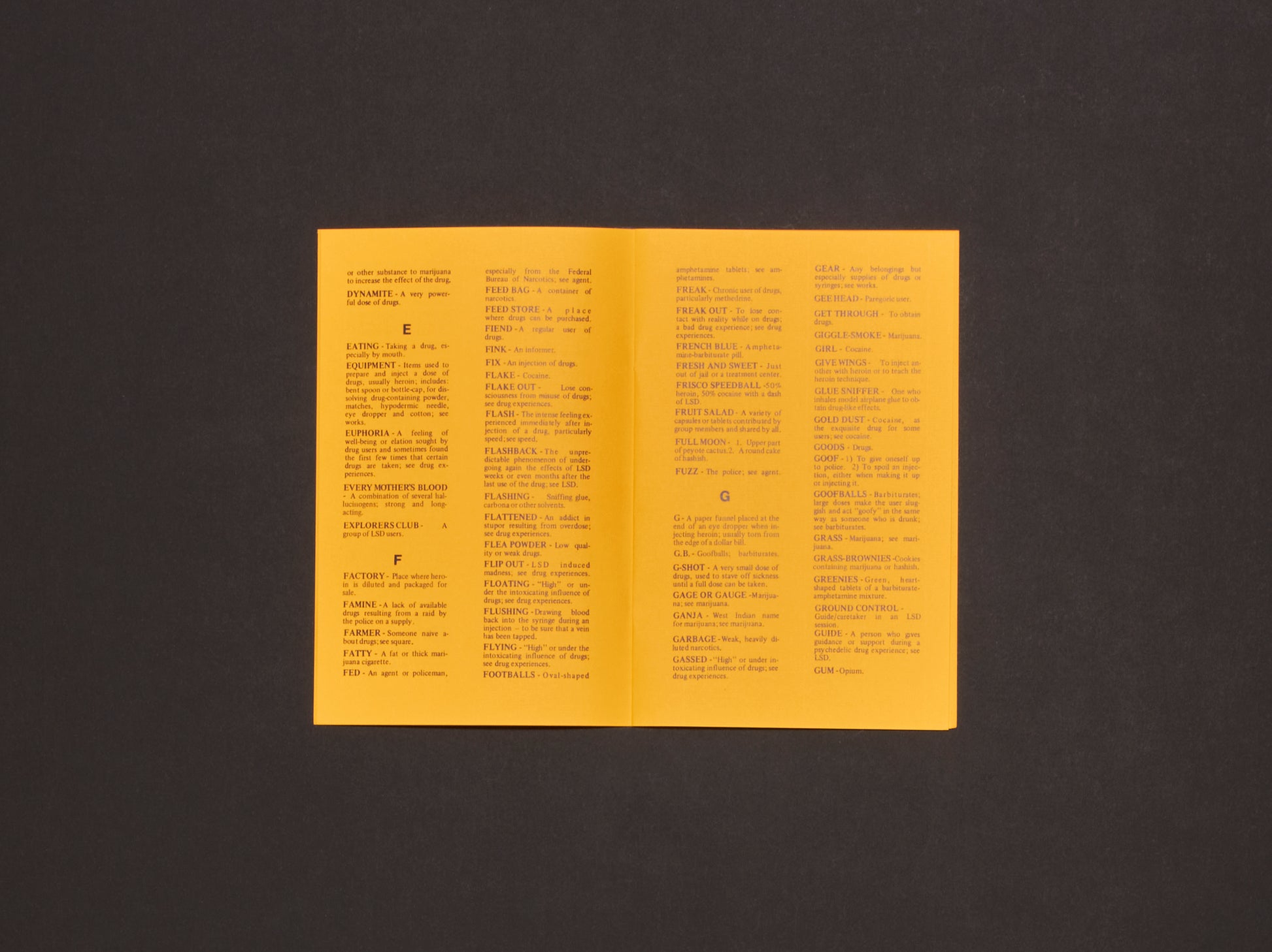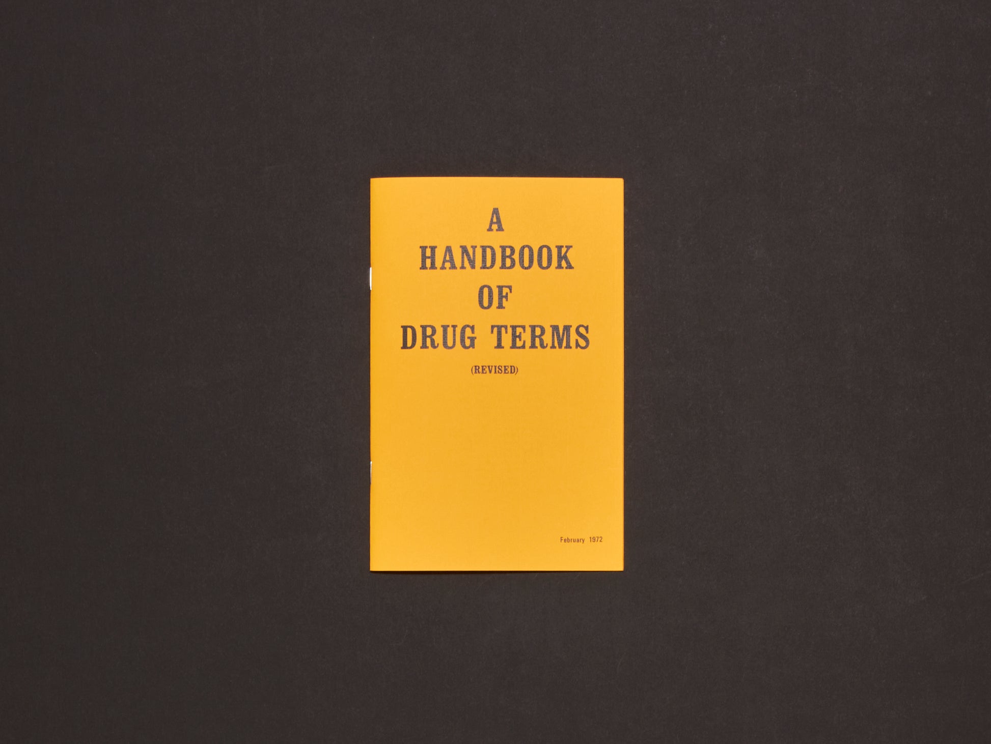 A facsimile of a brochure produced by the New York State government in 1972, A Handbook of Drug Terms outlines the new vocabulary that originated when recreational drug use entered the mainstream in the late 1960s and early 70s.