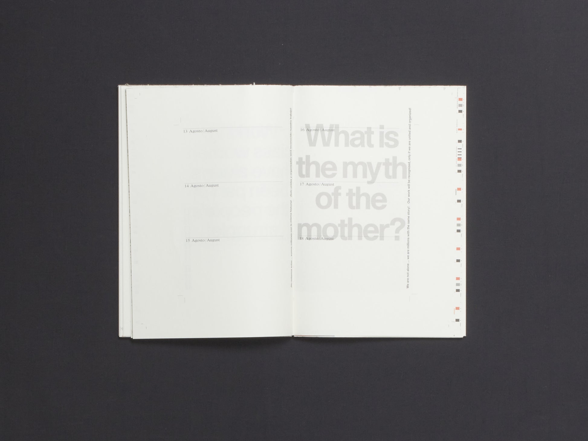 Cuaderno de Tareas is an invitation to time travel, offering a passage through reproductive labor, protest, and archival memory drawn from Ana Victoria’s time-spanning archive of feminist protest in Mexico. Throughout its pages, the phrases and slogans of feminist demonstrations reappear as persistent reminders of ongoing cycles of violence, and of the enduring resistance against them. At the heart of the publication are photographs from Ana Victoria’s same named series Cuaderno de Tareas, which affirm the dignity and political power of the repetitive, relational work that defines care labor. Through its unfinished appearance, the planner itself exposes the unseen labor of bookmaking and asks the reader to cut open its sealed pages.