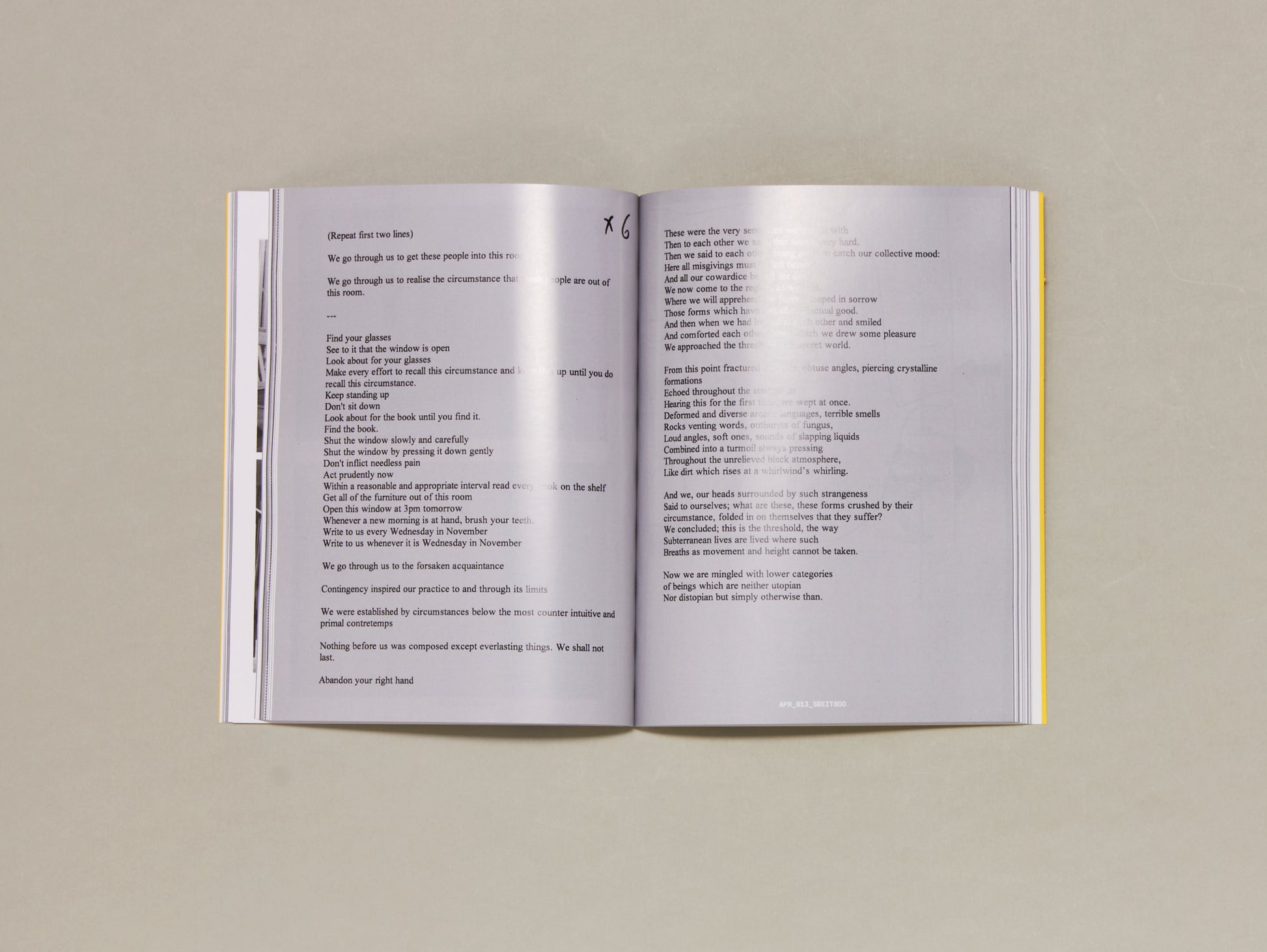 Gathered here are artefacts and evidence of the group’s activity up to the original date of publication, including but not limited to scores, email correspondence, reflective texts, photographs, drawings and planning documents. Across more than twenty chapters, significant, durational projects are surveyed alongside the partial, speculative and improvisatory. Asparagus Piss Raindrop’s work arises from the questions: How can we do things otherwise? What musical forms arise from and inform our daily experience? Performances typically draw on such things as recycled children’s games, group therapy, shapeshifting, declarations of ridiculous texts, geology, architectural intervention, gender theory, site specificity and slug reproduction.
