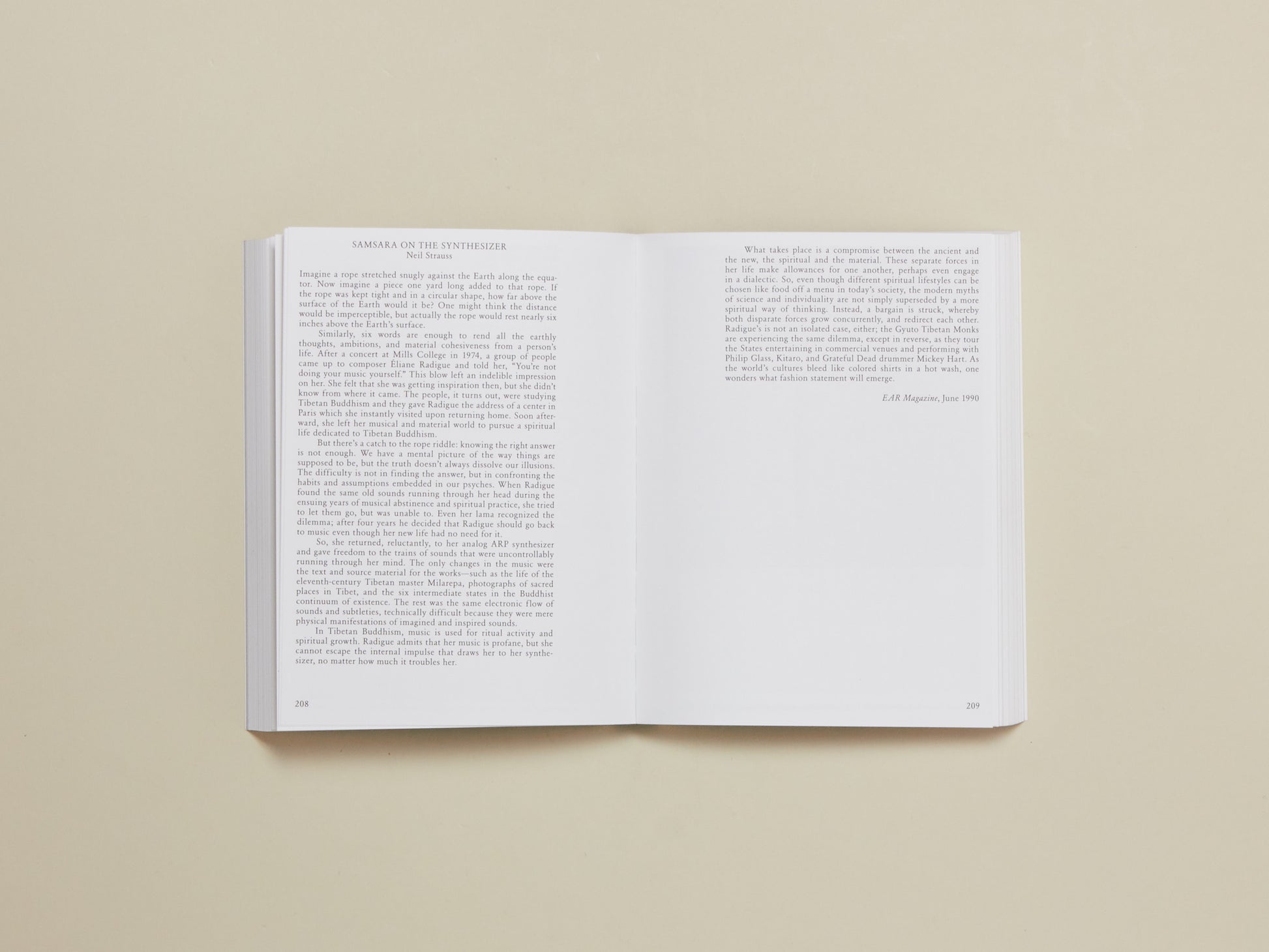 Among these entries is an in-depth overview by cellist Charles Curtis, a close collaborator of Radigue's, examining the composer's earliest experiments with feedback techniques and analog synthesis, her eventual shift to composing for unamplified instruments and live performers, and her unique aesthetic configurations of time and presence. A number of detailed conversations between the composer and researchers Georges Haessig, Patrick de Haas, Ian Nagoski, and Bernard Girard provide crucial insights into her working methods at different points throughout her career. Religious studies scholar Dagmar Schwerk reflects upon Radigue's profound 1988 synthesizer work, Kyema, in the context of Tibetan Buddhist thought and its history, while texts by musicians Daniel Silliman and Madison Greenstone examine, in notably different ways, the technical characteristics of Radigue's sound practice. Sketches for unrealized work, contemporary reviews, concert programs, and other ephemera mapping the performance history of Radigue's early work are presented together for the first time. The anthology concludes with a roundtable discussion between Curtis, Greenstone and Anthony Vine, untangling the knot of paradoxes at the center of Radigue's artistic practice to trace the thread of her continued "ethos of resistance."
