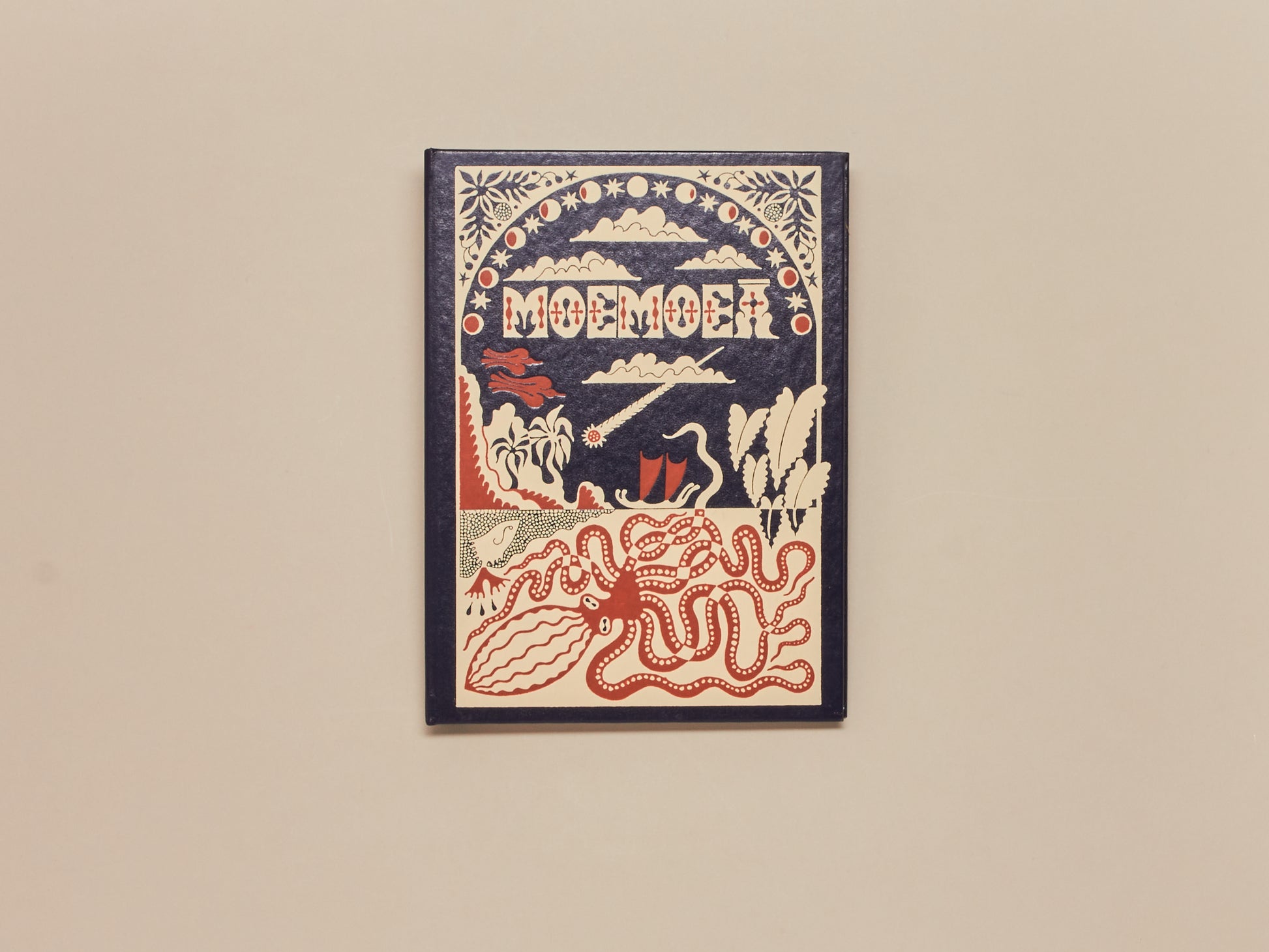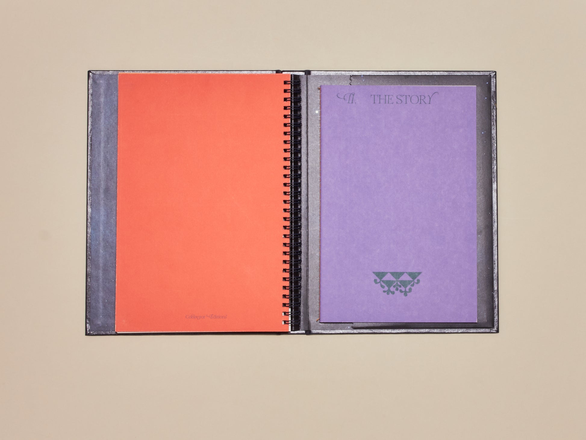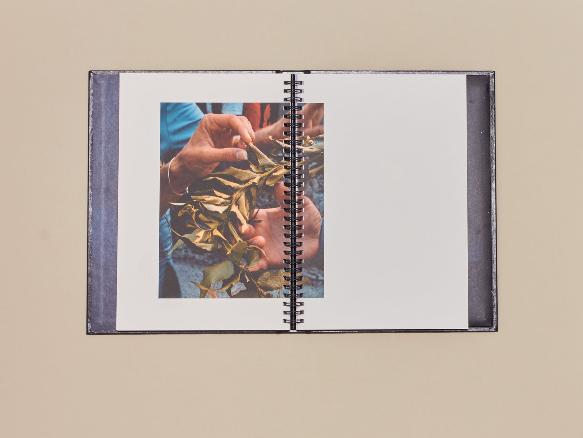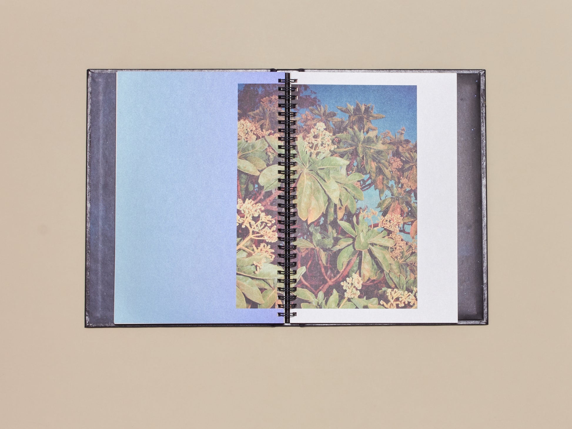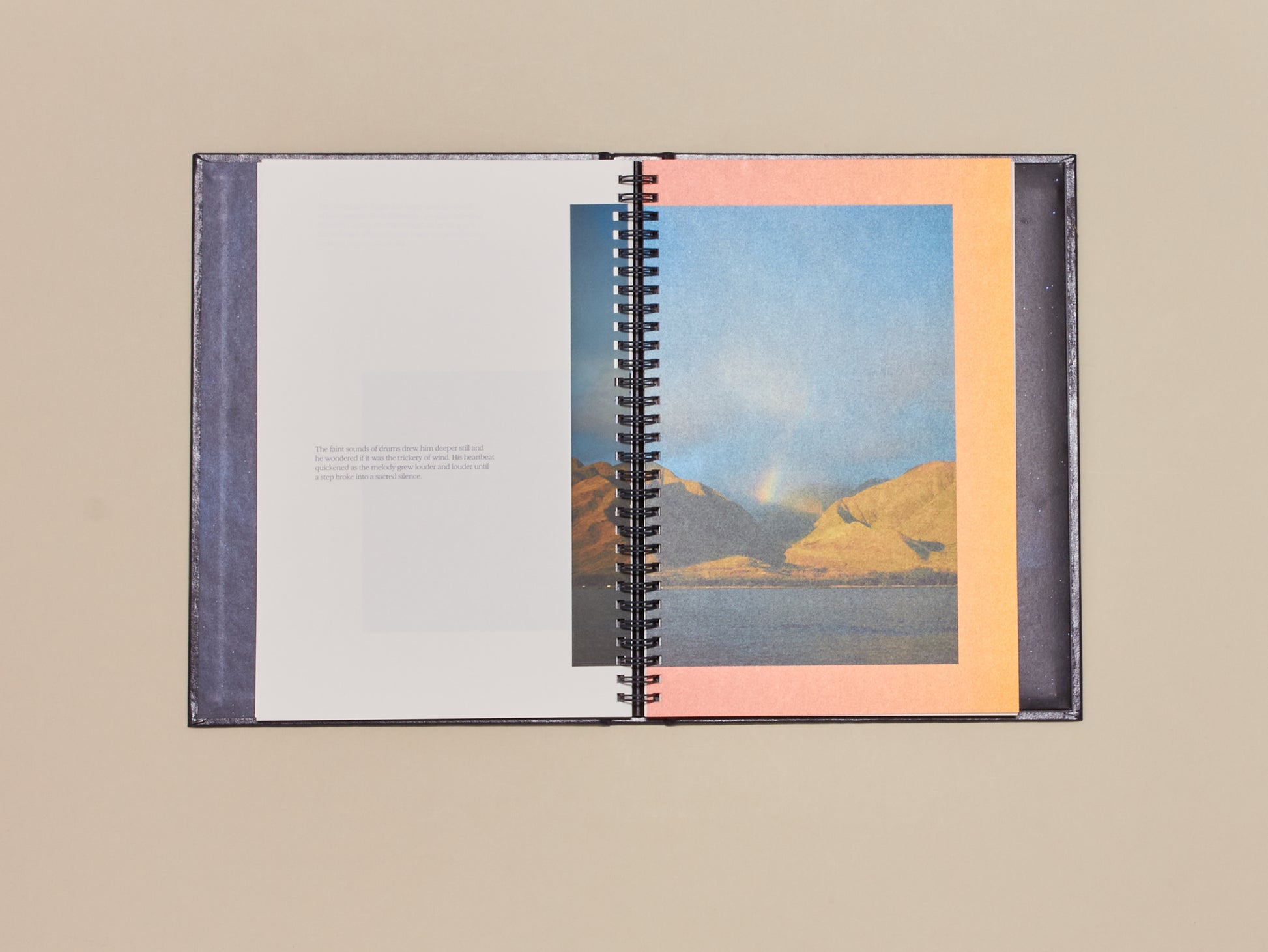The first book, The Spell, opens with a series of lush photographs that capture life on the open ocean, lulling the reader into a sensory experience. Drawn from ancestral voyaging mythology and the artist’s own visionary dreams, fragments of narrative text ebb and flow through the book, while illustrations by Sophy Hollington serve as visual footnotes. Taking inspiration from nautical logbooks, The Spell is wire-bound into a hardcover case and incorporates luminescent paper to evoke the glistening surface of the ocean.