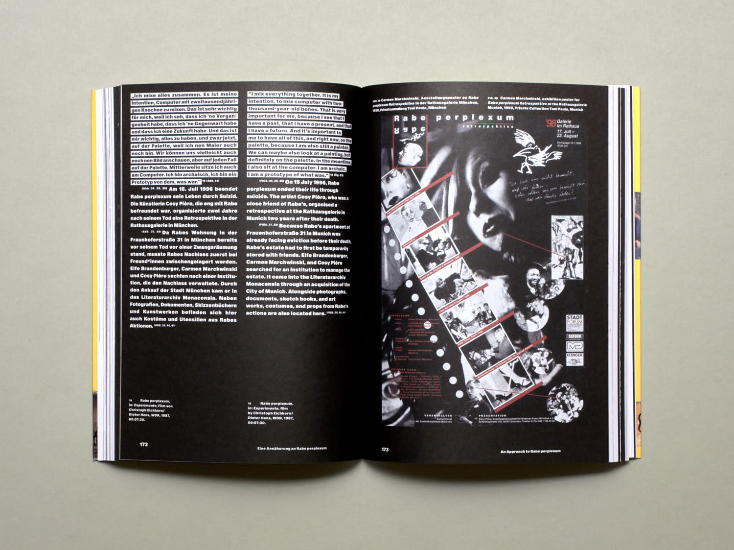Tabea Blumenschein (1952–2020), Hilka Nordhausen(1949–1993), and Rabe perplexum (1956–1996) were eccentric artists of the eighties – they deviated from norms and operated outside of the centre in subcultural milieus. . They worked in friendly constellations in the cities of Berlin, Hamburg, and Munich. Blumenschein, Nordhausen, and perplexum represented images of gender and identity that weren’t recognized at the time and lived their sexual orientations in a non-conformist manner. The artistic work of the eccentrics was formulated in performances, readings, films, concerts, or murals – in collaborative and often ephemeral forms. For the first time, they are now brought together in one book and discussed contextually.