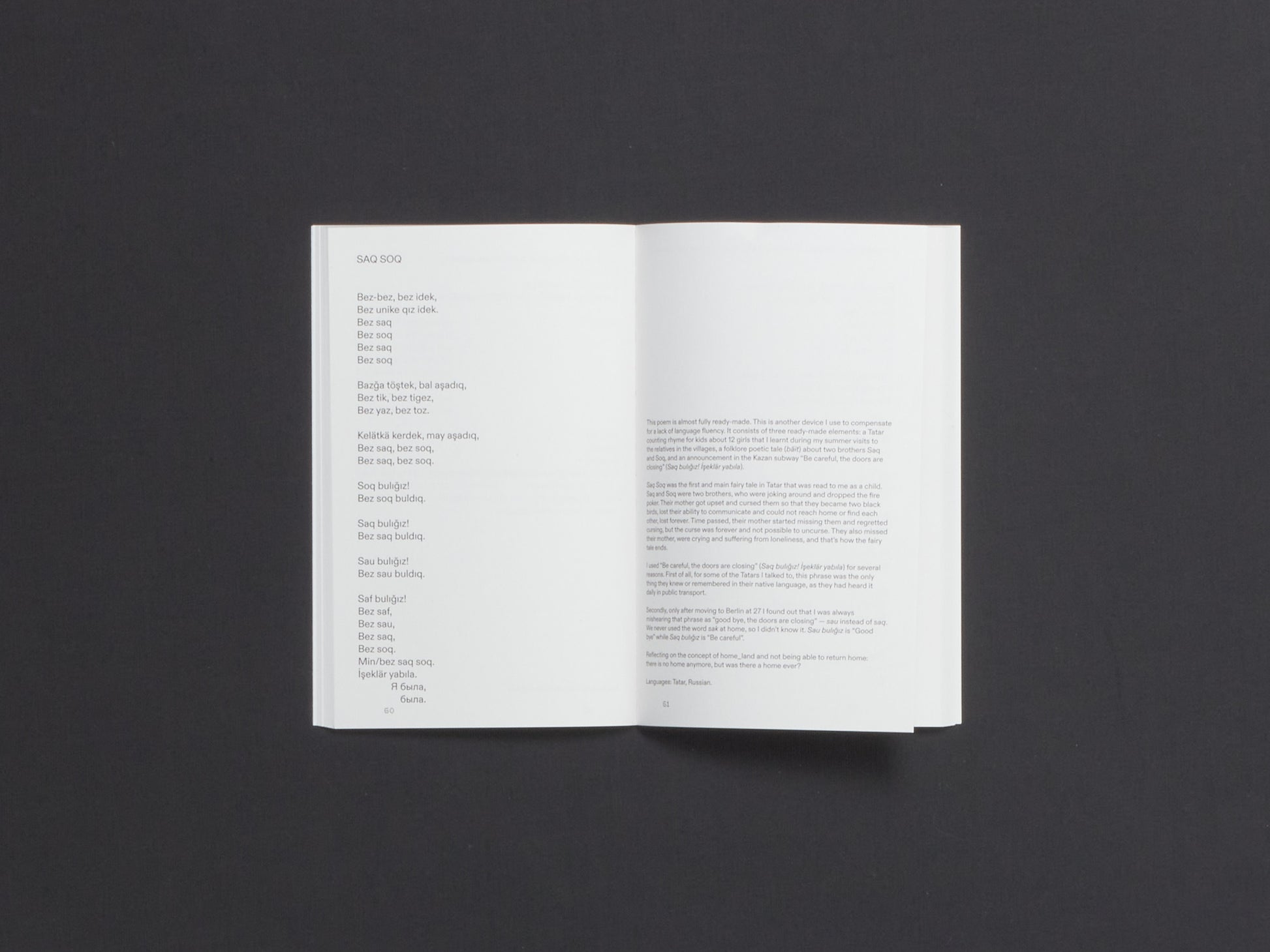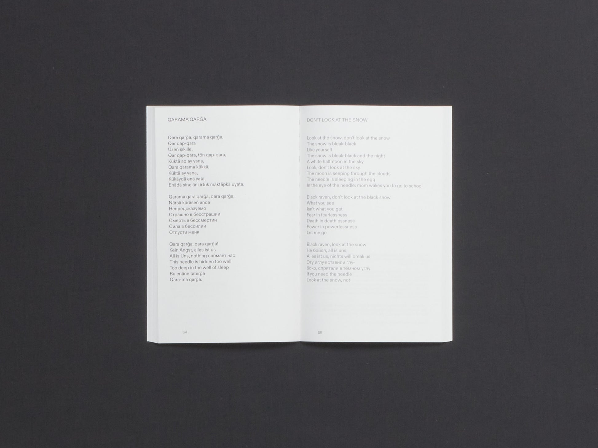 Lostlingual by Dinara Rasuleva is the first volume of the sdvig series, dedicated to translingual avant-garde writing. In this volume, Rasuleva, a Berlin-based poet, returns to Tatar, the language of her childhood. She had used it only rarely as an adult, and never before as a creative writer—the national language of her people, smothered by Russian colonialism. She sets herself the goal of composing poetry in Tatar as she remembers it, without consulting dictionaries and grammars. The result is a collection of fragile and liberatory translingual poems, in which Tatar, English, German, and Russian call out, respond to, and transform one another.