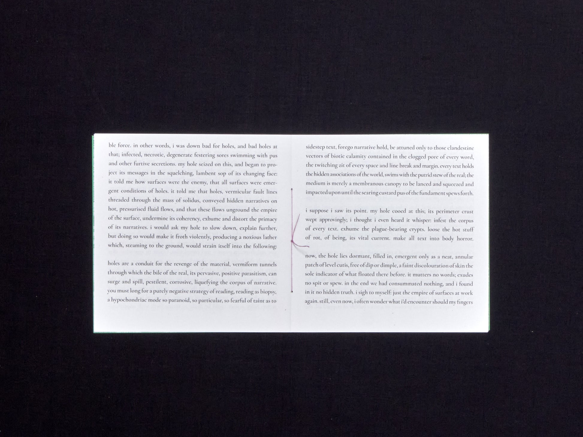 h( )le is a sick, sensual, only semi-fictional, exchange on hole ontologies between an infected welt and its conceptually ill-informed host. What’s in a hole? Are they really great, gaping repositories of nothing? And, if so: what IS that curdled stuff rising up to meet us? Each page turned is another finger dipped in the rancid erotics of h( )le. Pressure mounts; the hot flows of hidden narrative(s) swill against bare skin. Unstop that quivering geyser, that pucker of riven flesh! Call forth the thick stew of the fundament! Show us, once and for all, what a hole is REALLY full of! Based on actual events.