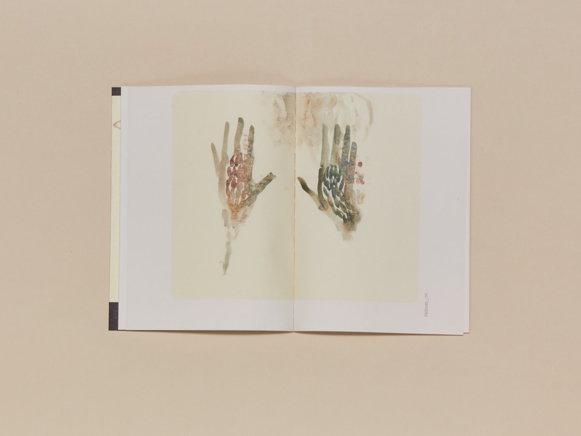 The double-page spreads from her sketchbooks reveal a profound connection with these sites, serving as intimate ‘fieldnotes,’ where the flowing watercolors allow motifs—such as eyes, hands, leaves, and seeds—to transform and merge.