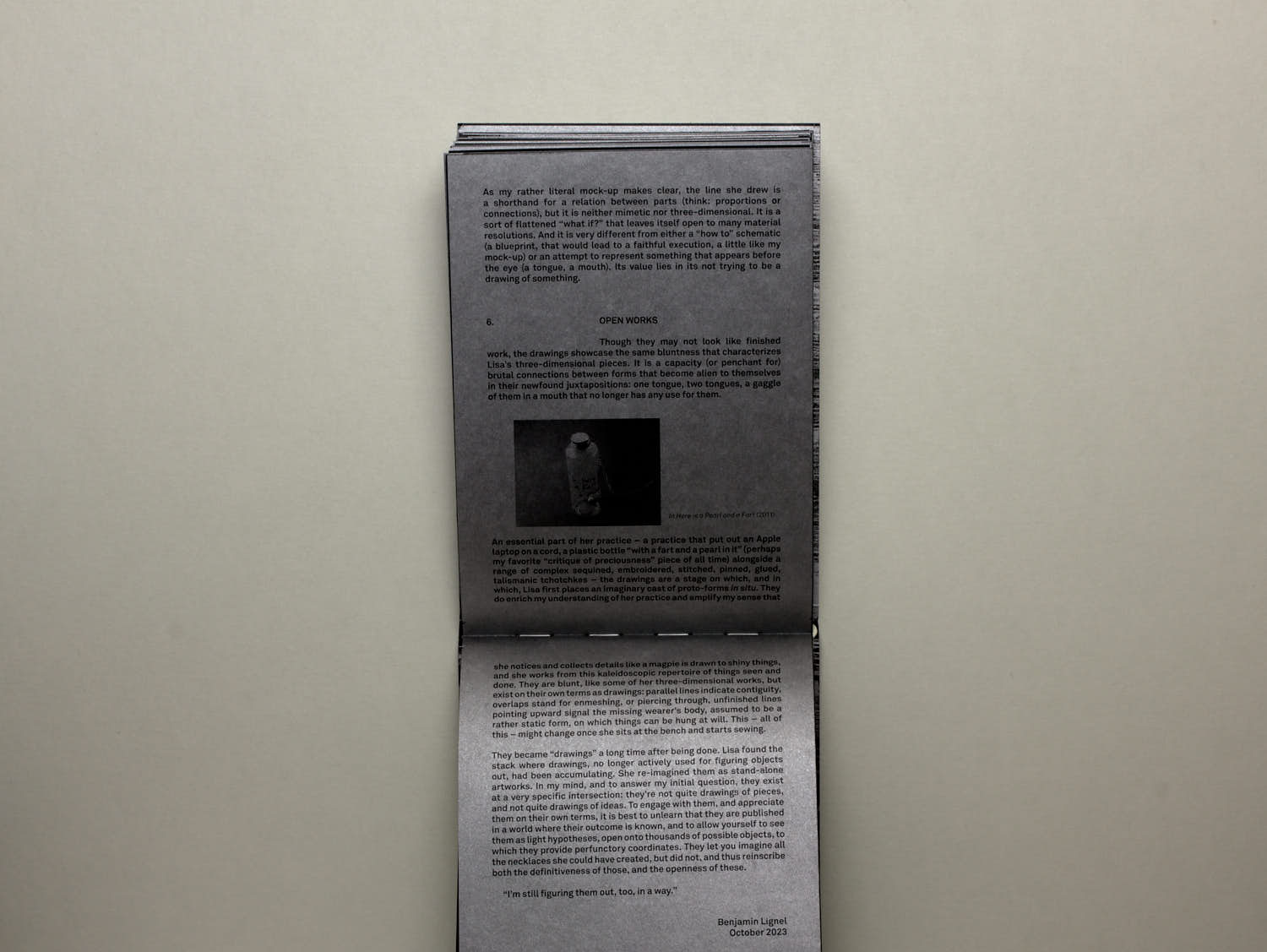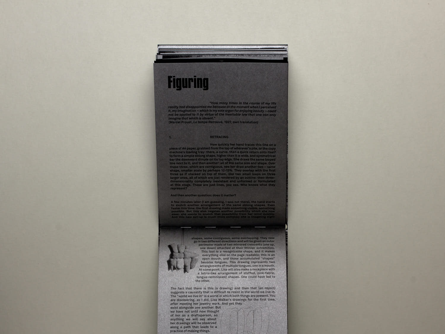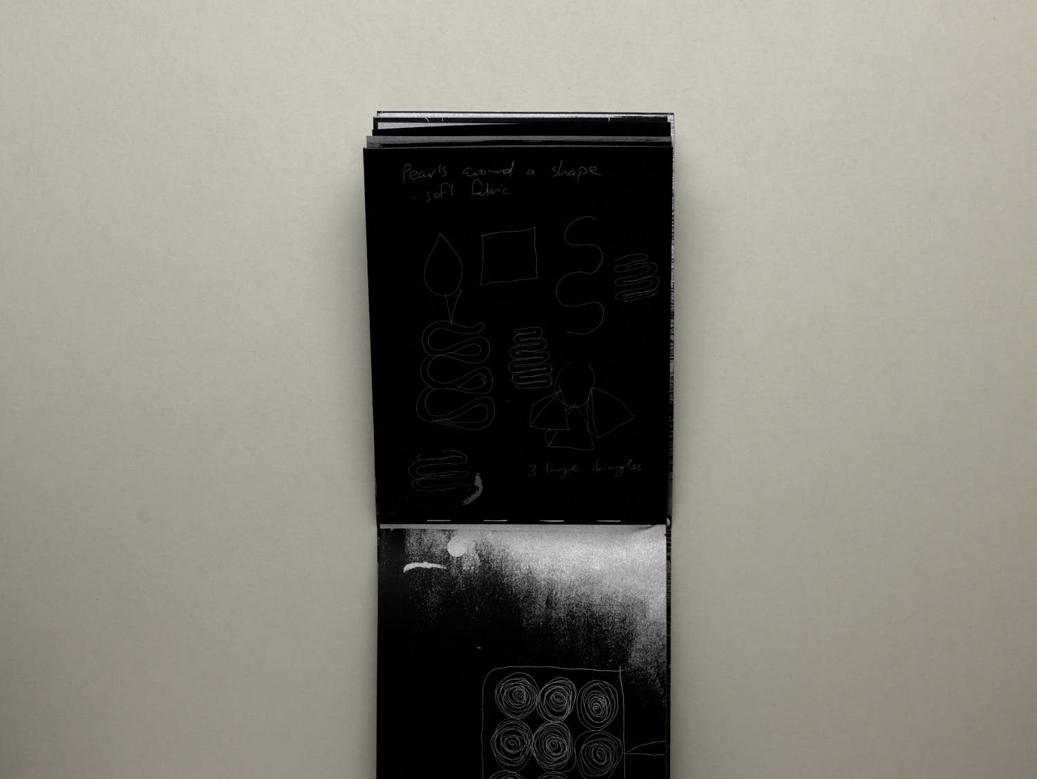 Jewellery Drawings by Lisa Walker is exactly that: a selection of drawings that later became Jewellery. The insight into what is in progress, unfinished. The only visible hints between Lisa's brain and the works. The drawings are an exclamation of the thoughts, on a piece of A4, scrap or from the home printer. The biro, felt-tip pen or pencil, closest to the hand. The book will make you lean left and right to witness the unfinished.