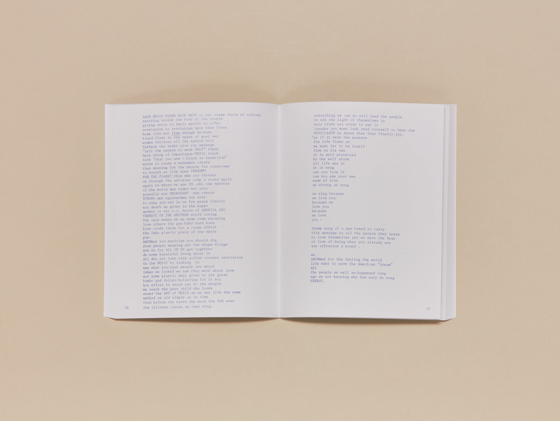 In 1977, Art Ensemble of Chicago Publishing Co. published Jarman’s Black Case Volume I and II: Return From Exile, a collection of writing conceived across America and Europe between 1960 and 1975. Comprised largely of Jarman’s flowing, fiery free verse—influenced by Amus Mor, Henry Dumas, Thulani Davis, and Amiri Baraka—the book also features a manifesto for “GREAT BLACK MUSIC,” notated songs, concert program notes, Jarman’s photos, and impressions of a play by Muhal Richard Abrams, the founder of the Association for the Advancement of Creative Musicians of which Jarman was also an original member. Jarman writes poetry of personal revolutionary intent, aimed at routing his audience’s consciousness towards growth and communication. He speaks with compassionate urgency of the struggles of growing up on Chicago’s South Side, of racist police brutality and profound urban alienation, and of the responsibility he feels as a creative artist to nurture beauty and community through the heliocentric music that he considers the healing force of the universe. A practicing Buddhist and proponent of Aikido since a 1958 awakening saved him from the traumatic mental isolation of his time dropped by the US army into southeast Asia, Jarman sings praise for the self-awareness realization possible through the martial arts. With cosmic breath as its leitmotif, his poetry both encourages and embodies a complete relinquishing of ego. While some of the poems contained within Black Case have already been immortalized via performances on classic records by Jarman and Art Ensemble of Chicago, its republication in print form breathes new life into a forgotten document of the Black Arts Movement.