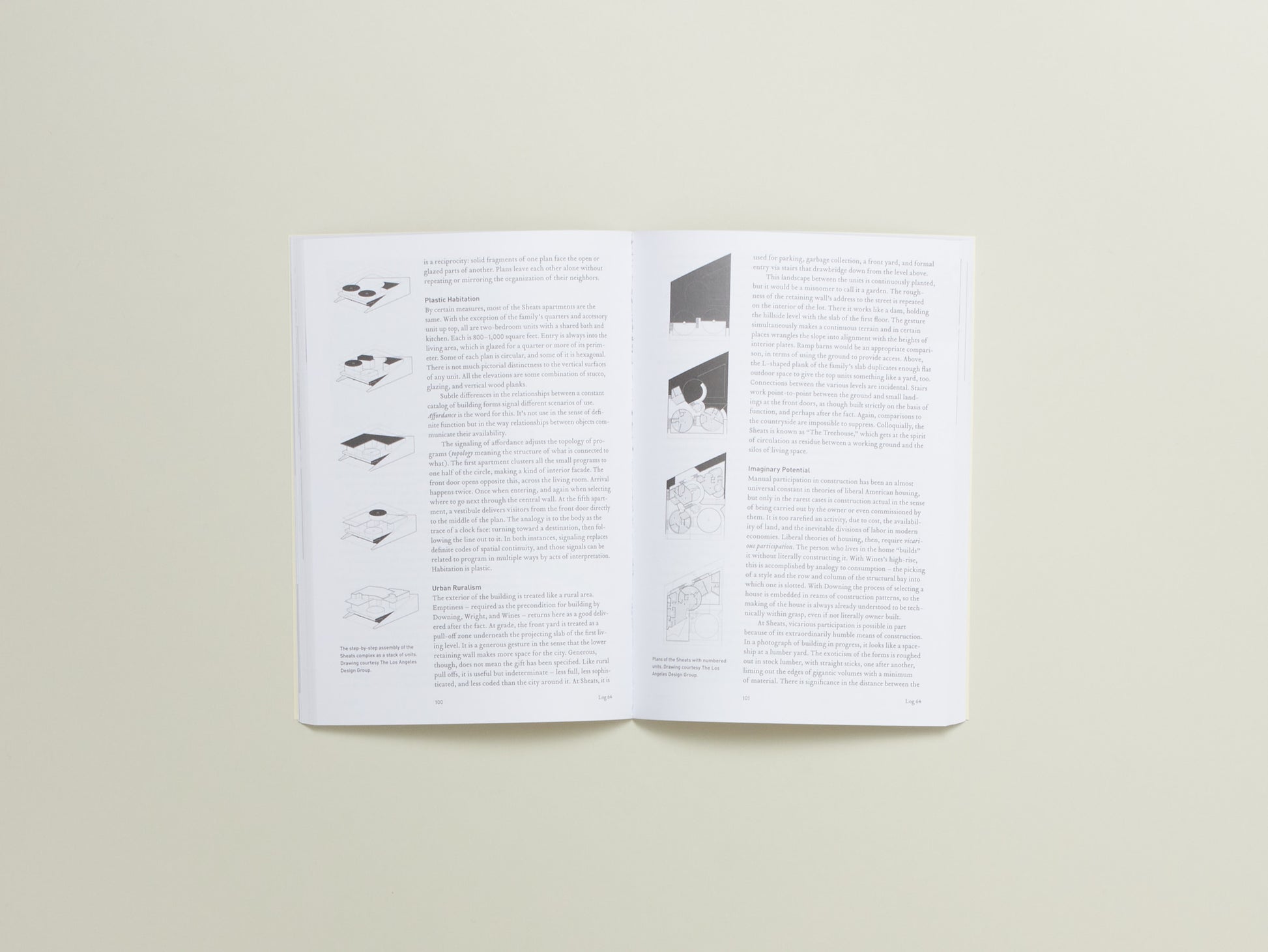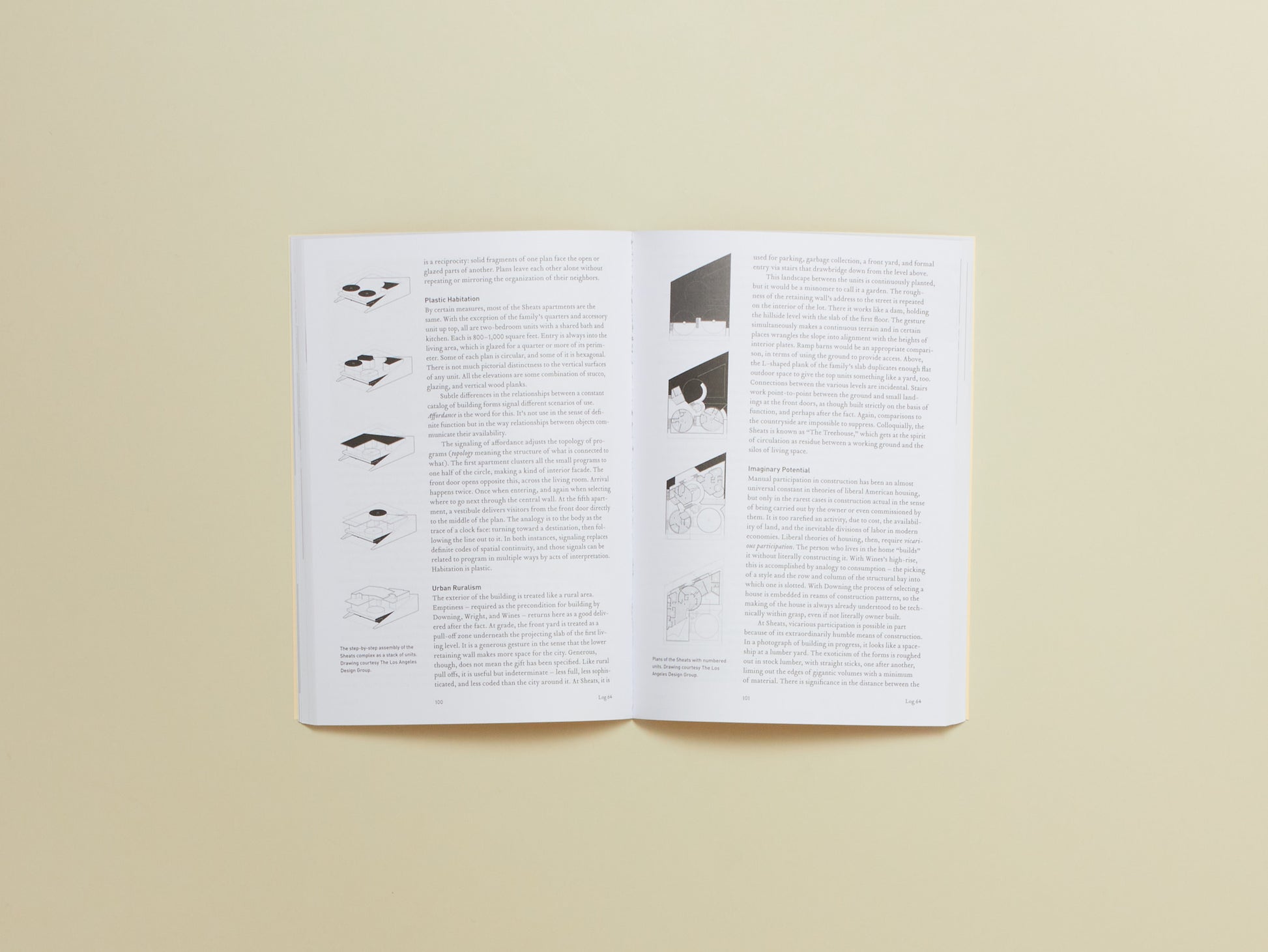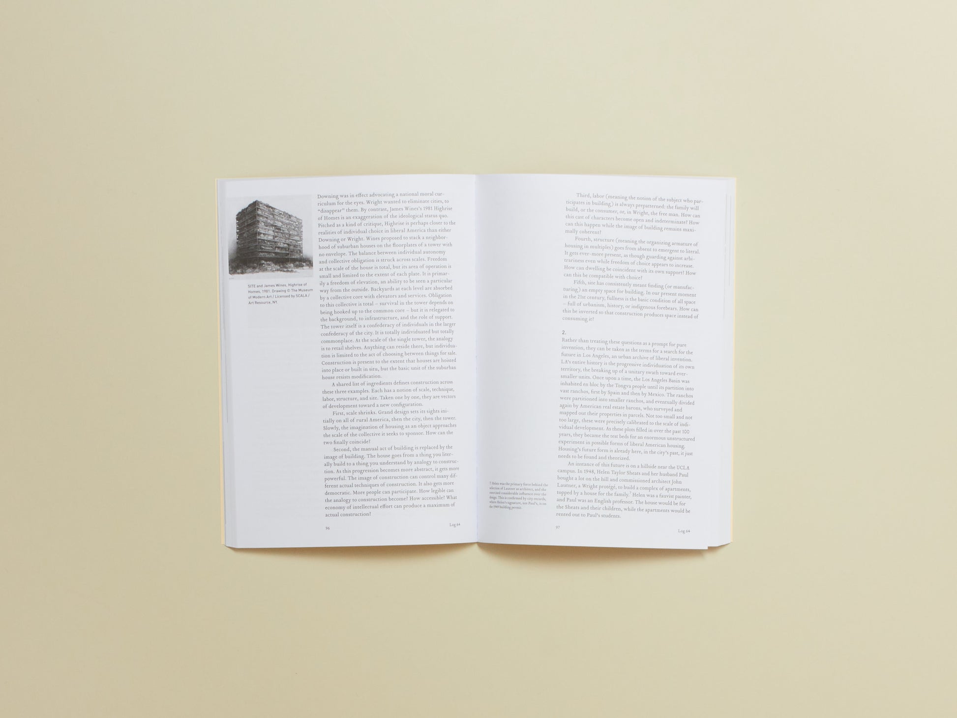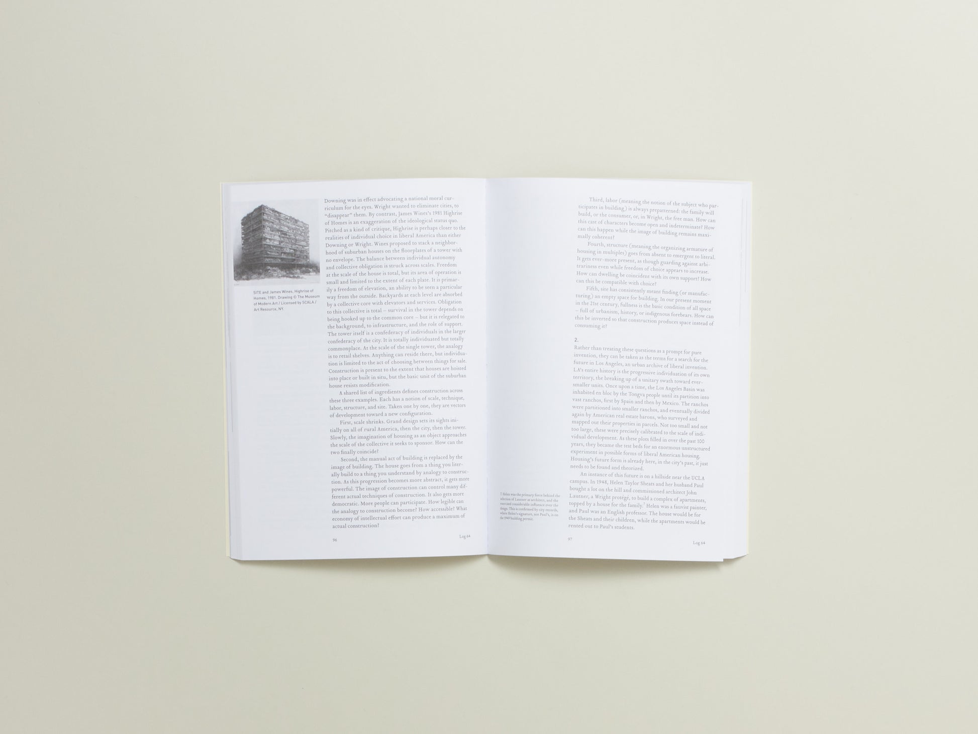 As guest editor Emmett Zeifman wrote in his prompt for Toward a Newer Brutalism, or the Undecorated Shed, “Log 64 appropriates New Brutalism as a found theory of architecture that looks like exactly what it is made of.” To wit, Matthew Au, David Eskenazi, Mira Henry, Mireia Luzárraga and Débora Mesa discuss the assembly of materials, while material flammability is the concern of Dan Spiegel and Megumi Aihara. Clark Thenhaus manipulates 3D printed concrete, Zak Garone Leazer and Fernando Garrido Carreras interrogate stone, Salmaan Craig addresses the properties of heat, and Andrea Machado Romero and Eric Kyle Cheung pose maintenance as a design question. The envelopes of heating and cooling plants are analyzed by Daniel Jacobs and Brittany Utting; Mohamed Sharif heralds SO – IL’s rejection of the double-loaded apartment building corridor; and Anna Neimark celebrates Gehry Associates return to a Brutalist architecture in homes for veterans in West Los Angeles. Housing is also the focus of pieces by both Albert Pope and Andrew Holder, at vastly different scales, while Vanessa Grossman revisits the Brutalist work, including a house, of João Batista Vilanova Artigas. Aaron Forrest, Adam Frampton, Jeannette Kuo, Ajay Manthripragada, Jesús Vassallo and Yasmin Vobis talk with Emmett Zeifman about their work; Mark Foster Gage and Todd Gannon exchange views on Brutalism today, and Mark Linder reconsiders Alison and Peter Smithson’s “brutal intelligence” and “vulgar sophistication.” Mingru Han assess Liu Jaikun’s Chinese Brutalism, Preston Scott Cohen makes an argument for isomorphism, Joe Day posits a brut nouveau, and Peter Eisenman asks who’s Brutalist today. Wes Jones probes the meaning of form follows function, MOS draws up an undecorated shed, Daria Moatazed-Keivani builds with students, and Cameron Rowland documents “public use.” In assembling these voices under the rubric of Newer Brutalism, Zeifman writes, “Naming something provokes debate over the definition of terms, sustaining critical discourse and advancing architecture toward a conscious relationship to its history, limits, and potentials.”