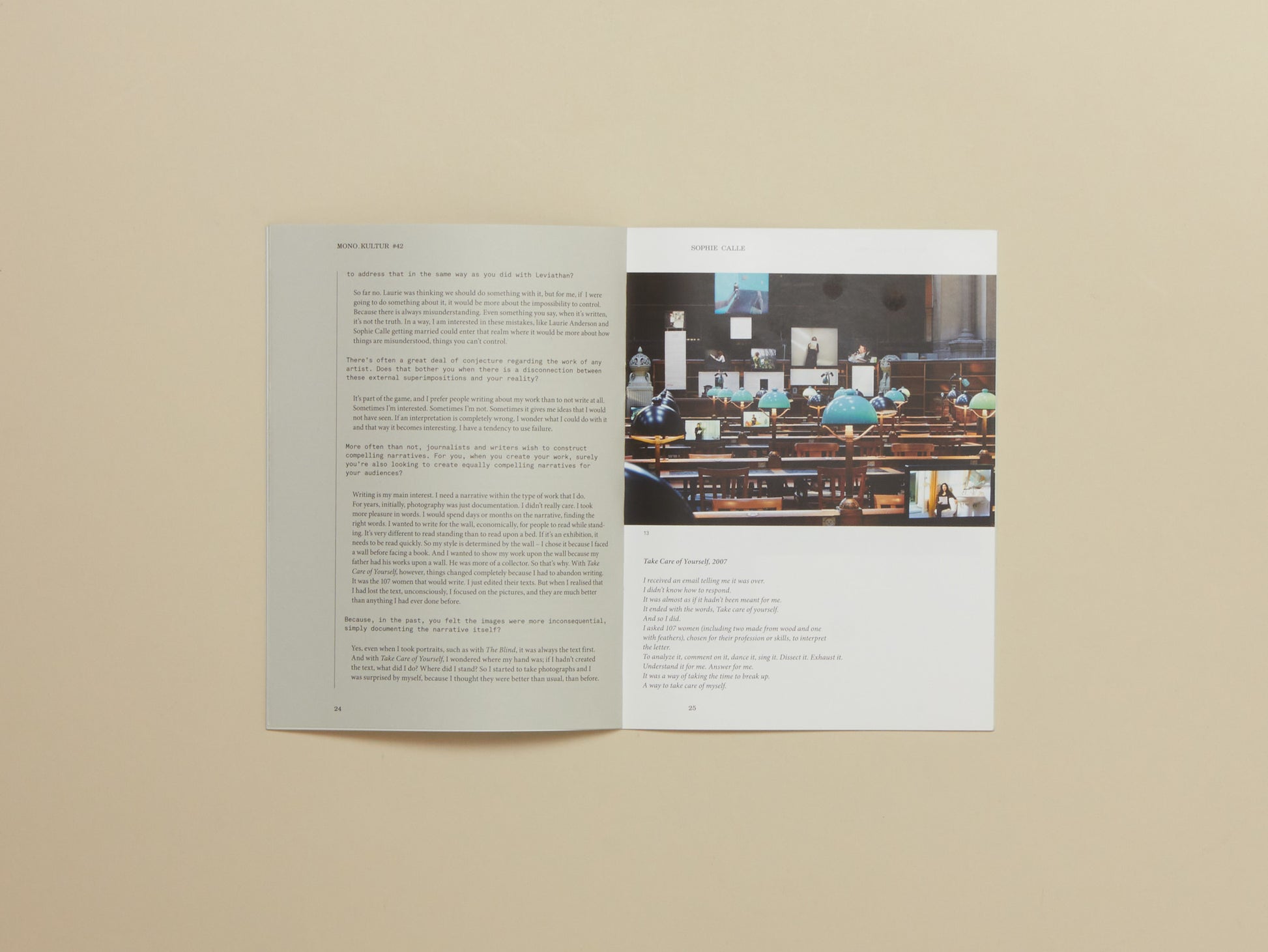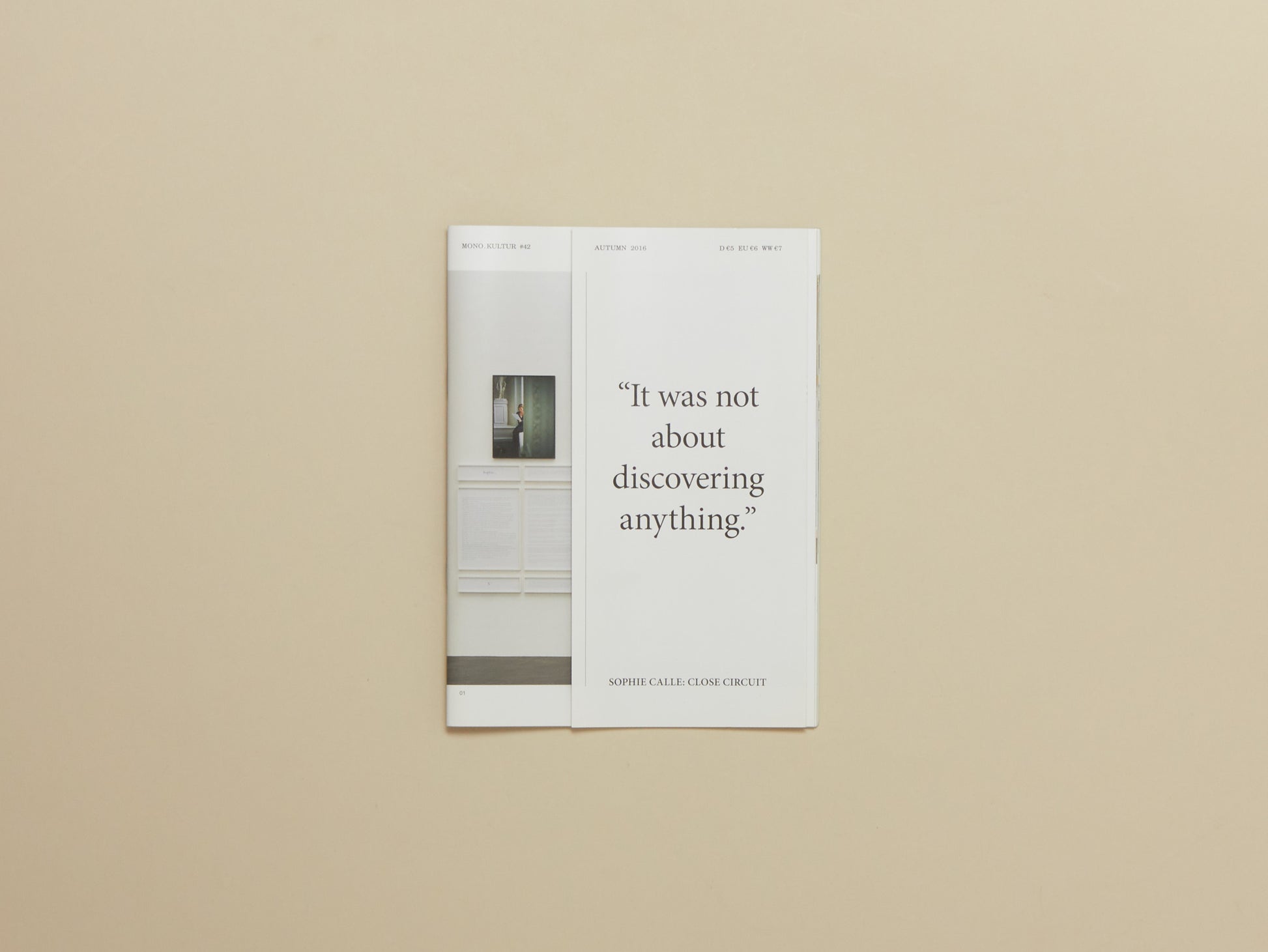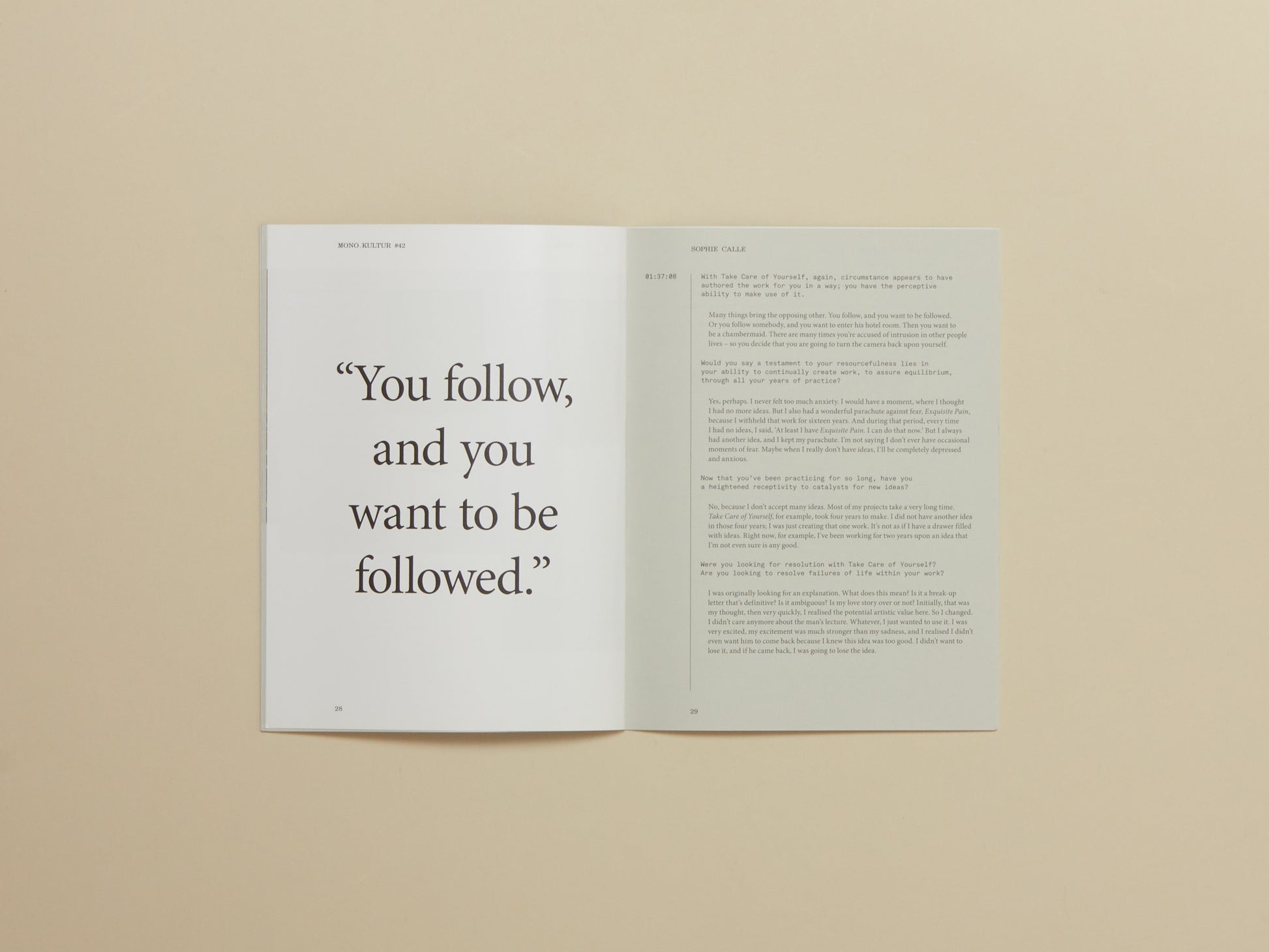 In a casually and enigmatically meandering conversation with mono.kultur, Sophie Calle talked about starting her career by being lost in Paris, the pleasure in abandoning control and buying her own grave in California.