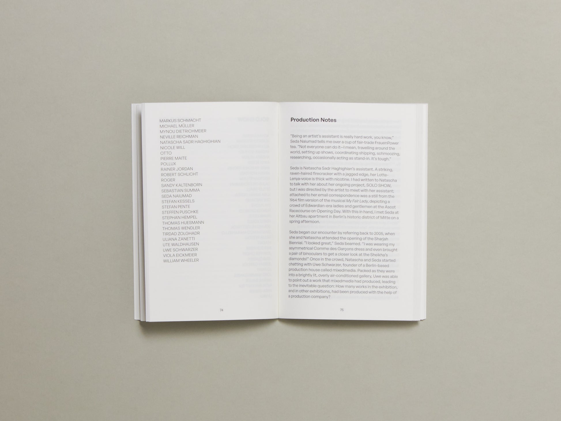 She primarily creates works in the fields of installation and performance, text and sound. As an individual or collective artistic position, she frequently allows her practice to flow into political, social processes. She addresses the activist aspect of artistic work and reassesses the conditions and spaces for aesthetic research and artistic action. Disconnecting the artist from representative roles or political instrumentalisation has always been an integral part of Natascha Sadr Haghighian's artistic practice. As early as 2004, the artist initiated the CV exchange platform bioswop.net, where concepts such as identity, representation, facts and self are renegotiated and the fetish of the "artist's biography" is undermined. For her participation at the German pavilion for the 58th Venice Biennale, she intentionally misspelled her name as "Natascha Süder Happelmann".