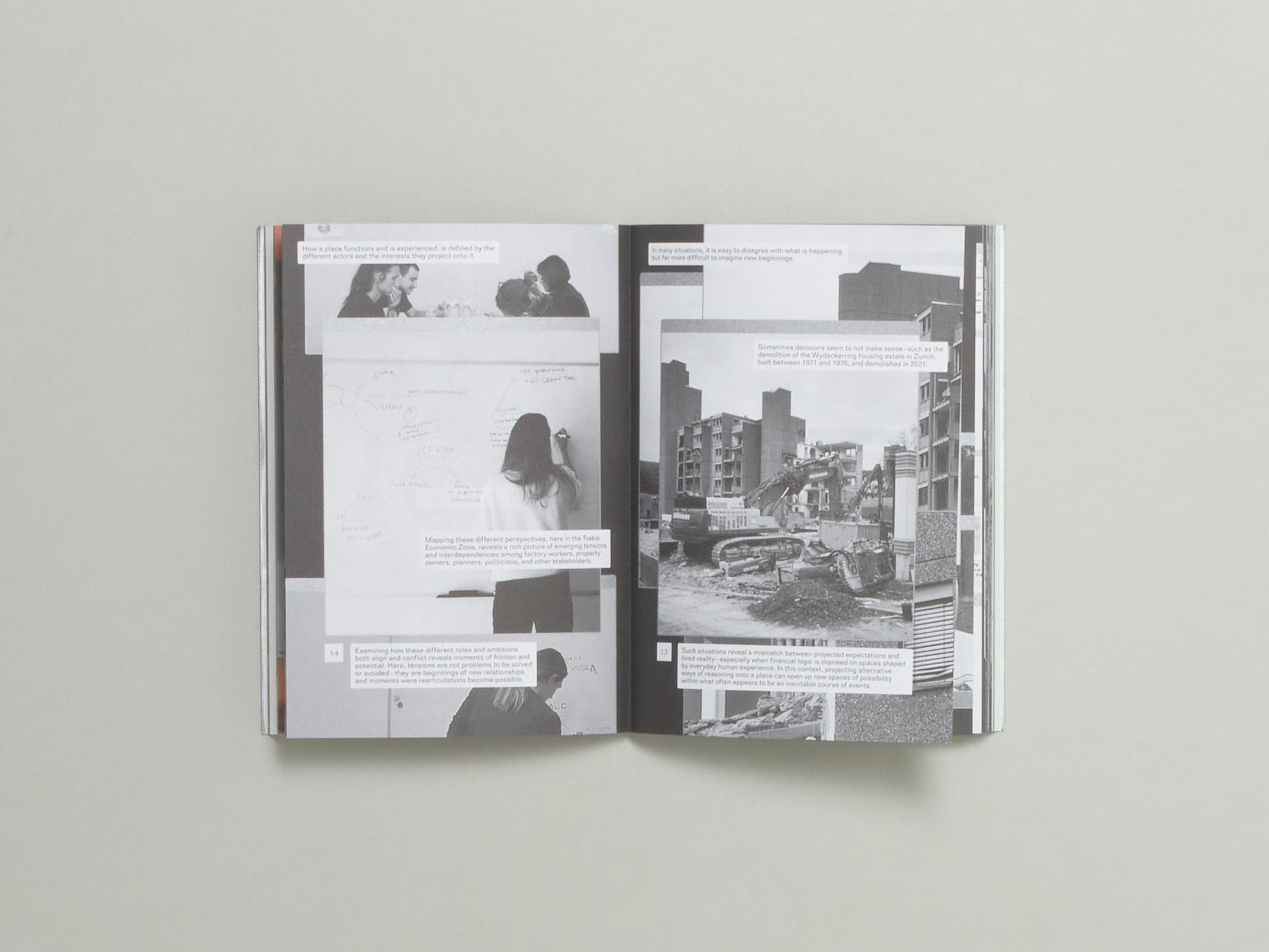 Portability catalyses functionality: designed to be held close, carried around and frequently referenced as a habitual working companion. Inside, the narrative is distilled across four chapters, each organised around a verb: ‘to project’, ‘to experience’, ‘to sequence’, and ‘to activate’. These verbs arise twice within each chapter: first as a contextual survey of established disciplinary practices within the field of architecture and urban transformation (as the Action); and second as a speculative invitation to re-enact these practices in nascent forms (as the Primer). These latter sections offer rumination on NEWROPE’s ongoing pursuit of collectivity as a methodology to address the urgent complexities of our times. Tested within NEWROPE’s Design in Dialogue Lab this investigation uses tangible elements such as props and performative mock-ups as instruments to affect new forms of communication and engagement. Understanding the book as not only a narration of these collaborative rehearsals but a companion to future performances, we come to realise its self-fulfilling function—a prop for tacit co-creation.