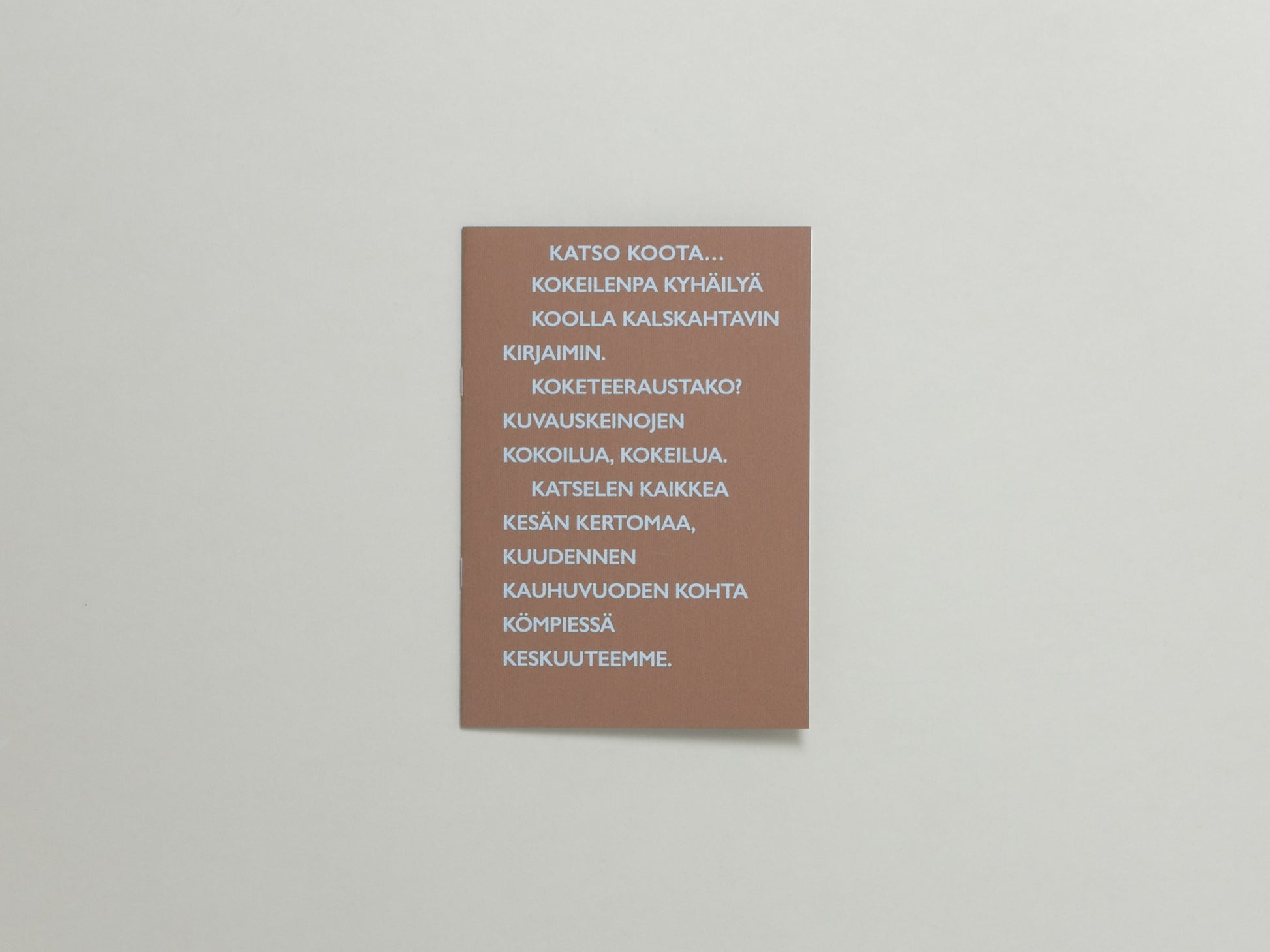 ‘Katso Koota’ is an early example of Finnish modern alliterative writing, a lipogram, a literary technique in which every word must start with the same letter. Laiho’s ‘Katso Koota’ predates the French Oulipo (‘workshop of potential literature’) of the 1960s. Considering that he produced his ‘constrained writing’ under conditions of extreme political and cultural confinement, it can be considered a true form of avant-garde subversion.