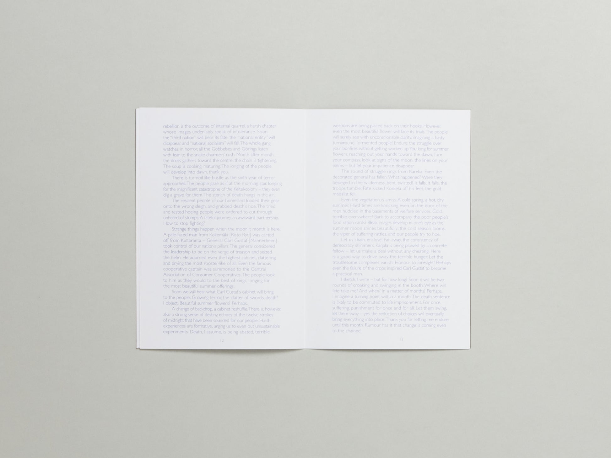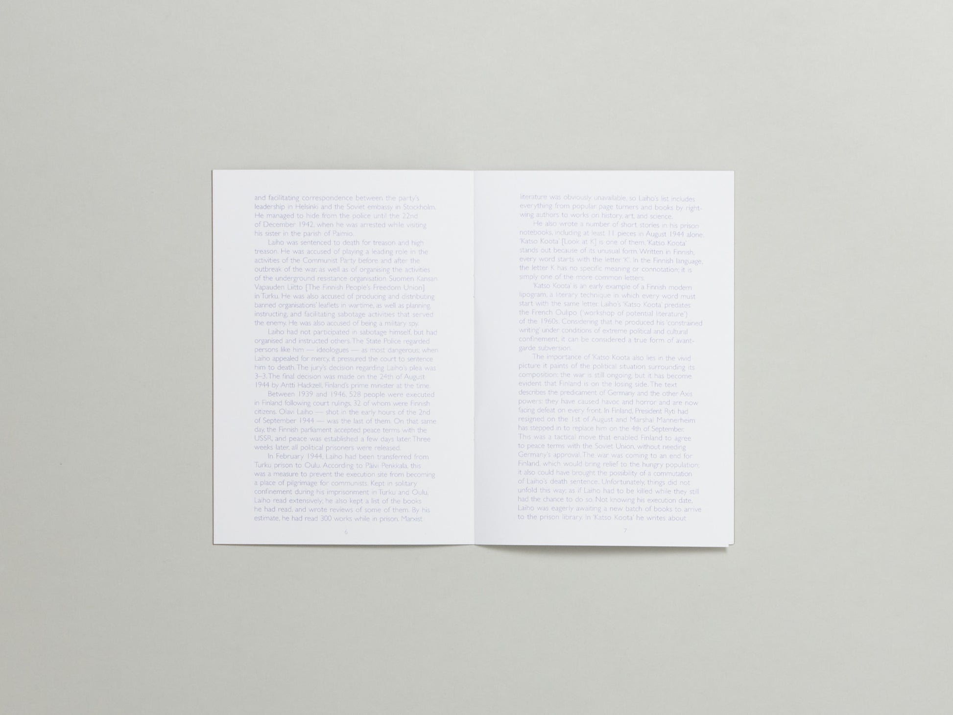 Just a couple of weeks before his execution, Laiho wrote a remarkable essay ‘Katso Koota’ [Look at K], using only words starting with the letter K. It gives a vivid picture of the political situation of the time: the war is still ongoing, but it has become evident that Finland is on the losing side. Not knowing his execution date, Laiho eagerly awaits a new batch of books to arrive at the prison library, enjoying his coffee substitute and the sound of distant music ...