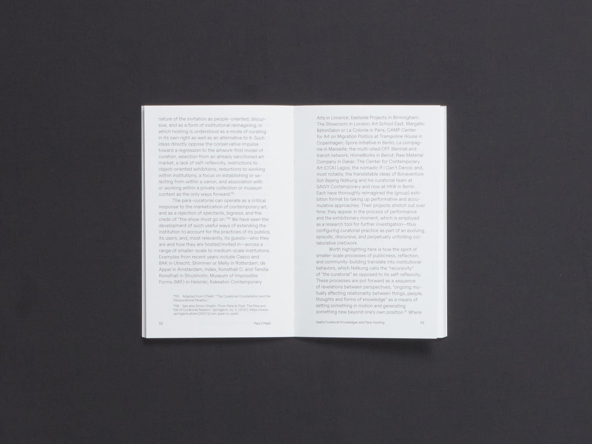 What can established art institutions learn from small-scale organizations' approaches to invitation, hosting, and publicness? In Beyond Caring: Para-hosting as Curatorial Escape, Paul O'Neill explores how new forms of invitation can reimagine host–guest relations and open escape routes from fixed institutional roles. Moving between speculation, critique, and proposition, the essay introduces "para- hosting" as a cooperative methodology of generosity and self-organization without absorption. For O'Neill, para-hosting is a form of escape that enables transformative possibilities beyond existing power structures within institutions and otherwise.