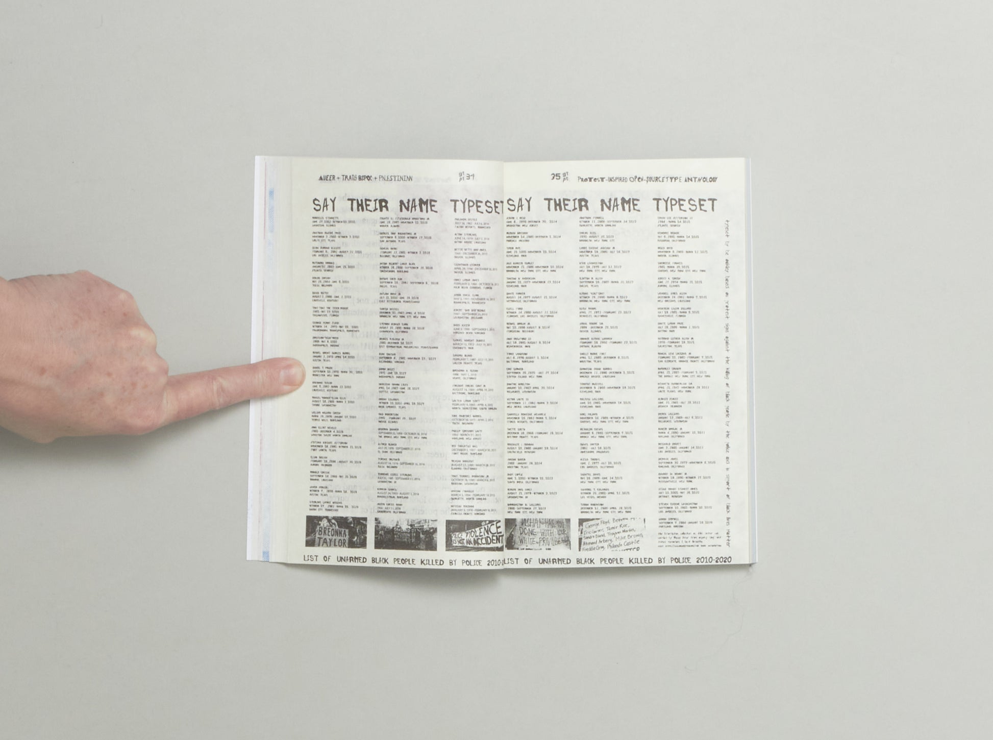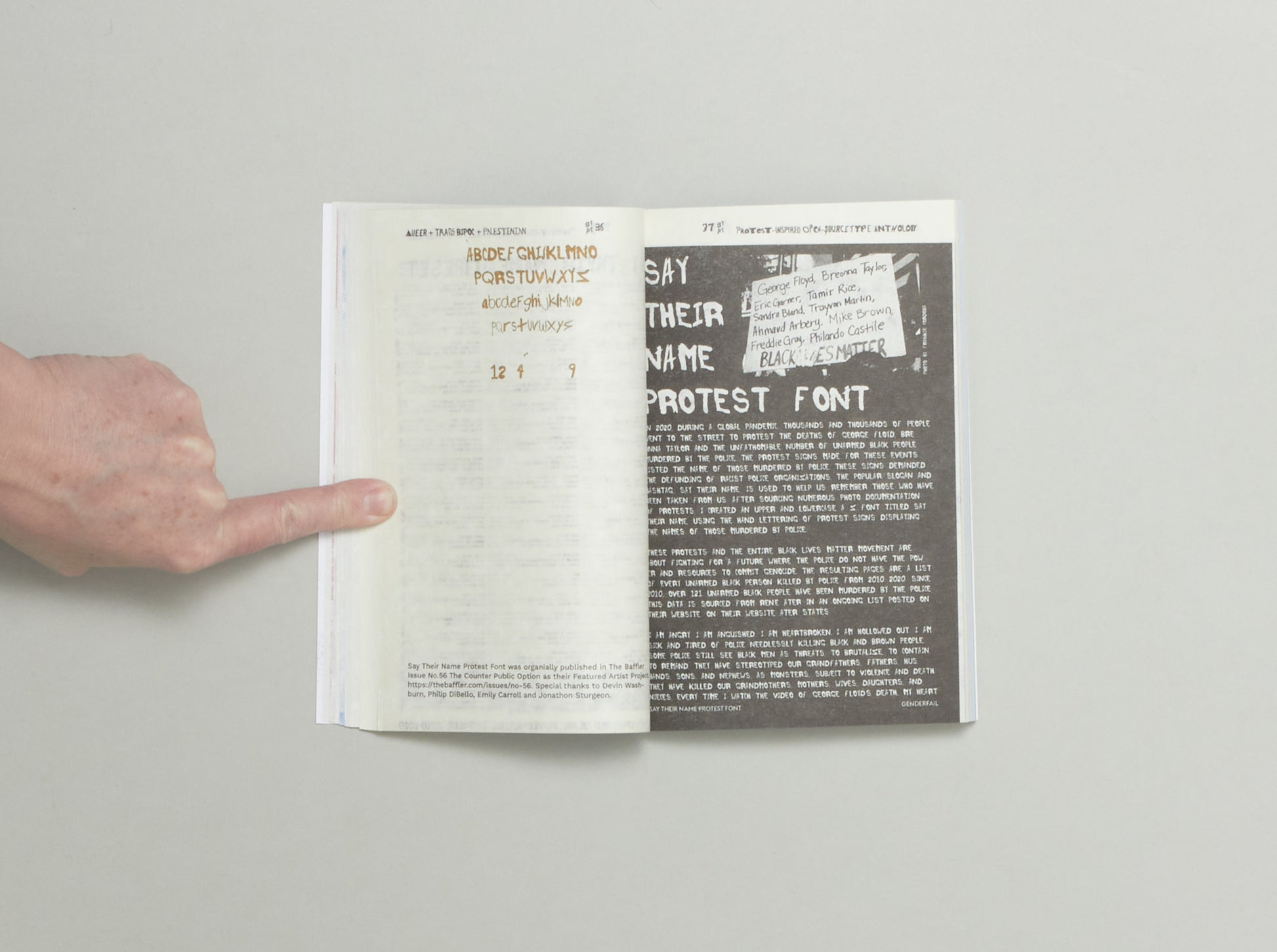 Queer + Trans BIPOC + Palestinian Protest-Inspired Open-Source Type Anthology: GenderFail Anthology of Queer Typography Vol . 3 is the 3rd in an ongoing series of publications, workshops, and programs exploring queer and trans exploration and experiments in typography. The anthology features the 11 GenderFail protest-inspired open-source fonts that are sourced from powerful moments in the history of dissent in the United States. At its heart, this anthology is about the 38 open-source graphics of an unknown number of examples that exist. Many publications on typography display fonts in their cleanest, idealized, theoretical form, but often fail to show the impact of the font in the lived world. The fonts are begging to be used, shared, and to make as significant an effect as possible. Seeing these typesets used by fellow artists and activists to make their work, communicate their ideas, and express themselves is one of the greatest honors as an artist interested in political activism. The book is available with either a blue or raspberry-colored risograph-printed cover.