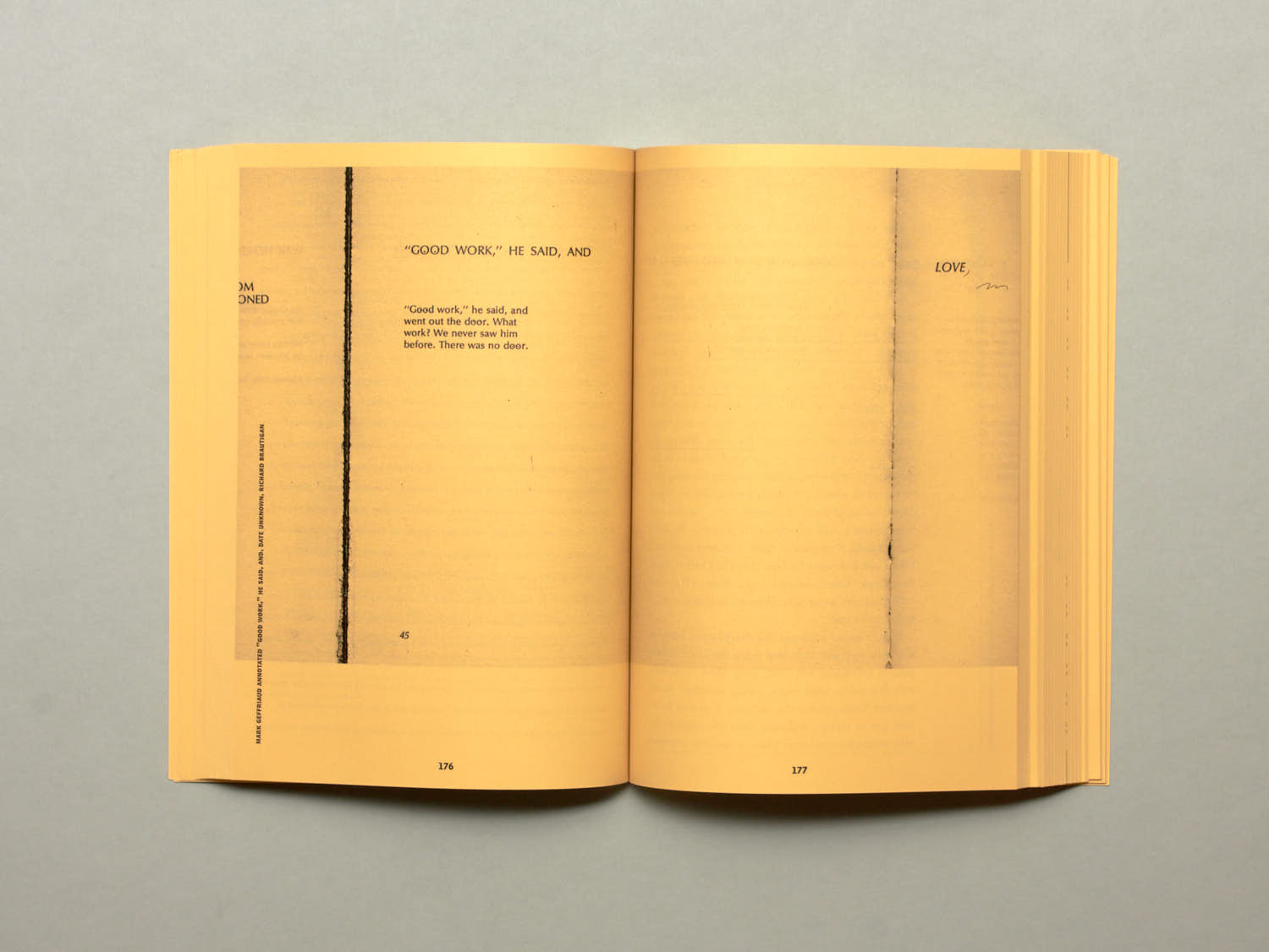 THE ANNOTATED READER is a publication-as-exhibition and exhibition-as-publication featuring 281 creative personalities responses and remarks on a chosen piece of writing. Ryan Gander and Jonathan P. Watts invited a range of people, encompassing contemporary artists, designers, writers, institutional founders, musicians and so on – to imagine they’ve missed the last train. “Is there one piece of writing that you would want with you for company in the small hours?” With this in mind, we asked people to submit a text with personal annotations and notes made directly onto it. With over 281 contributions collected over the last few months, we have gathered a selection of contributors including Marina Abramović, Art & Language, Paul Clinton, Tom Godfrey, Ragnar Kjartansson, Sarah Lucas, Alistair Hudson and Hans Ulrich Obrist. The annotation adds a further layer, making each piece unique and a historic record of our current times.