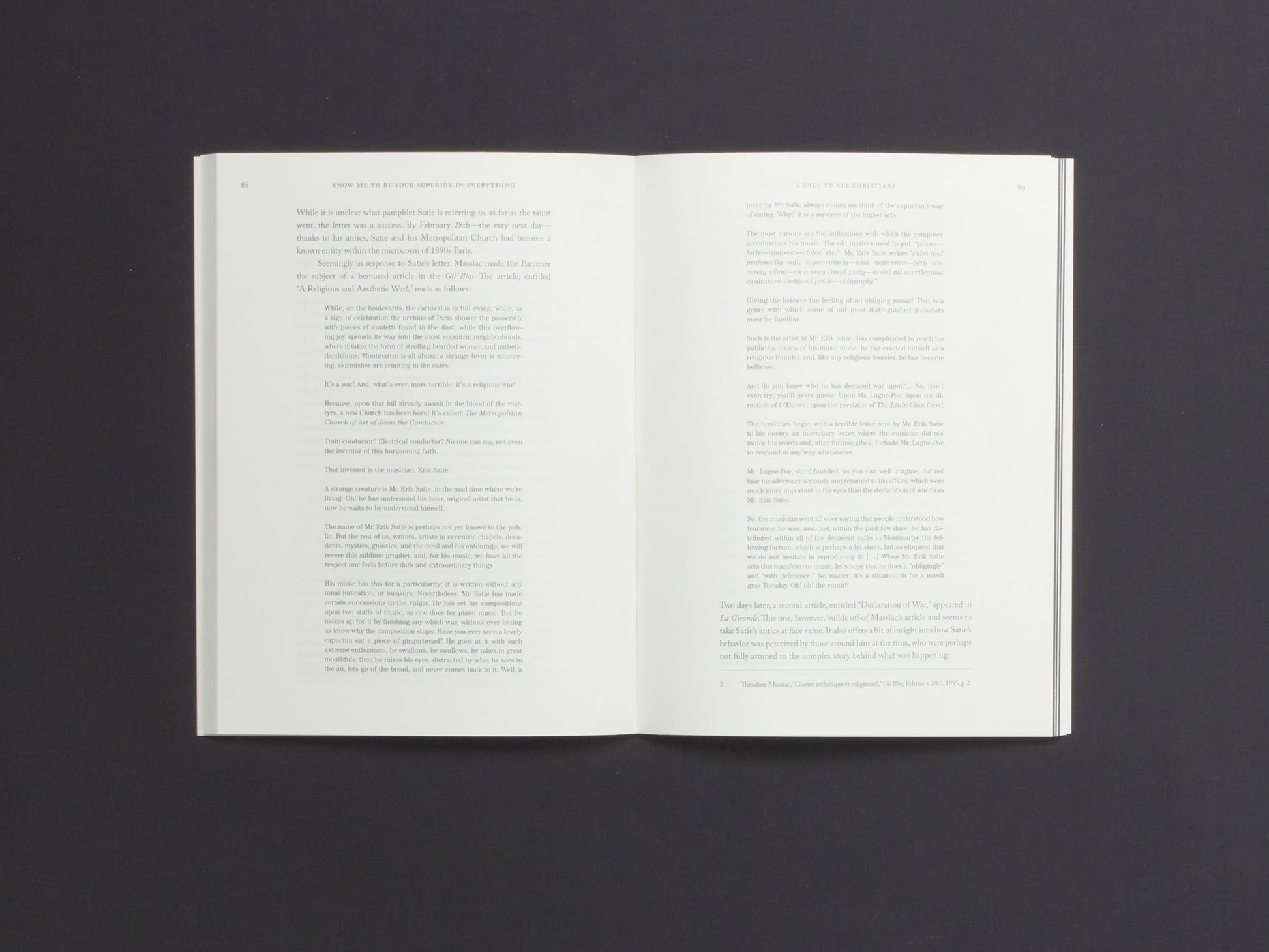 Know Me To Be Your Superior in Everything is the first book dedicated exclusively to the story of Erik Satie’s Metropolitan Church of Art of Jesus the Conductor. Drawing upon a multitude of firsthand sources—including documents held in the Erik Satie archives in Caen—the book includes new English translations of all known Church publications and correspondence by Satie as the Parcener. Facsimilic translations of Satie’s Church publications are reproduced herein as well, capturing, for the first time in English, the design and typography of the original productions.