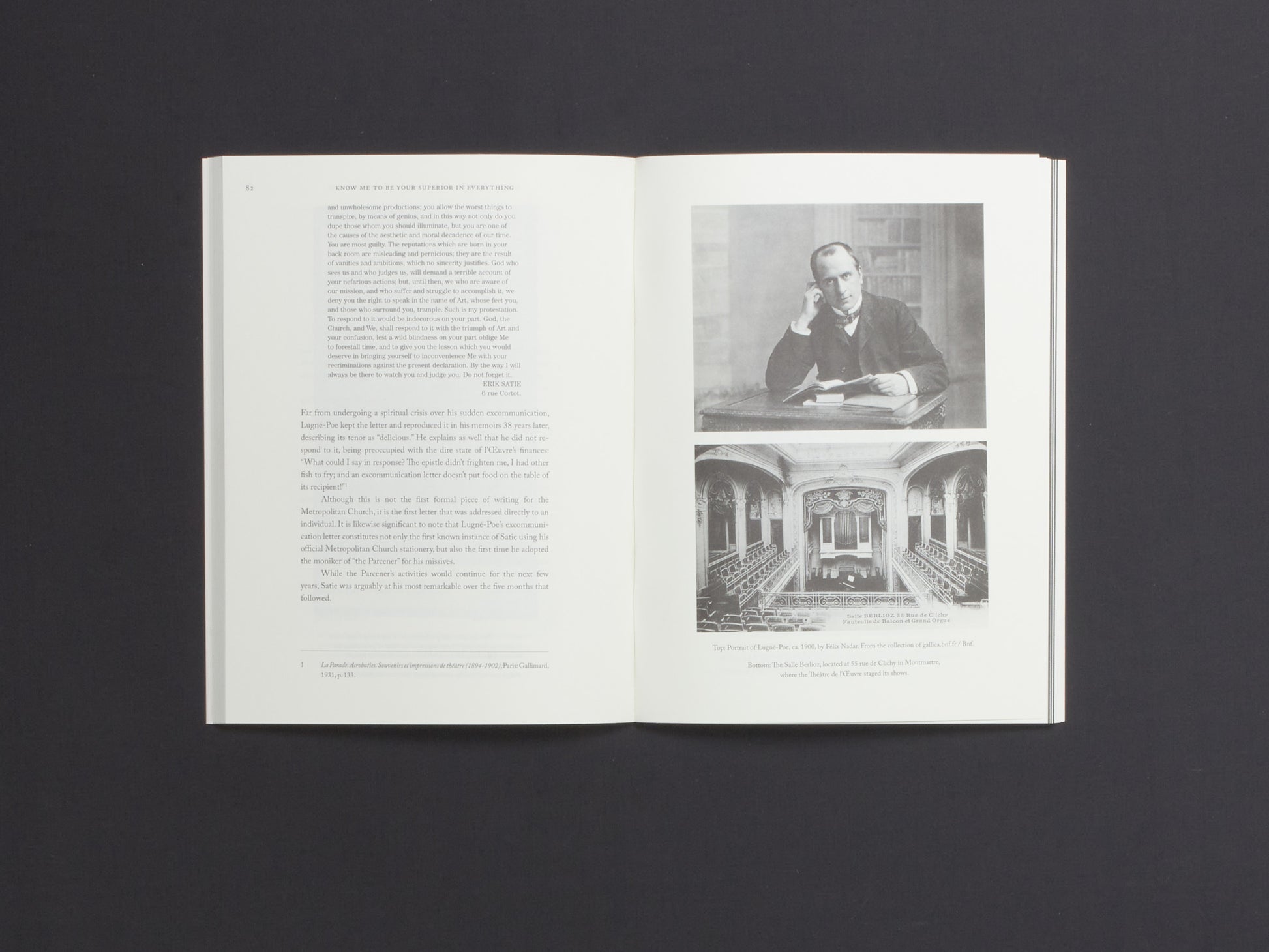 Transforming his dilapidated apartment into an “Abbatial Church,” Satie began issuing scathing letters to prominent cultural figures who had sought to render judgment upon his Art. Targets of the Parcener’s screeds ranged from the cape-clad mystagogue, Joséphin Péladan, to the pompous composer, Camille Saint-Saëns; from the novelist Octave Mirbeau, who had dared to lampoon the Parcener, to the theatre director Aurélien Lugné-Poe, whose unintentionally nude stage production had offended the Parcener’s moral sensibilities. The fiercest feud was reserved for music critic Henry Gauthier-Villars, whom the Parcener battled in the press for years, until the spat culminated in a physical altercation at a concert. Throughout the 1890s, luminaries, such as these, found themselves excommunicated from a church to which they had not even known they once belonged.