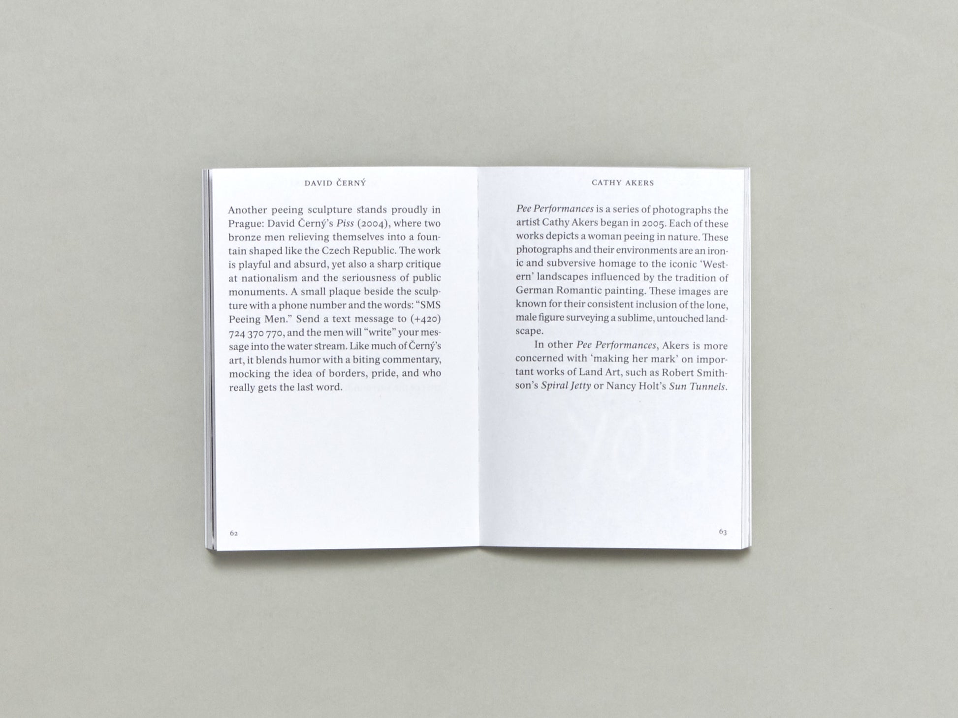 The state and design of public restrooms in a city, or an entire country, can reveal a lot about its hierarchies and values: who holds power, who is cared for, and who is excluded. While men often enjoy free and plentiful access, women are frequently expected to pay. And what about transgender and non-binary people? What about the 2.6 billion people around the world who simply have no toilet at all? The basic human right to relieve oneself in dignity and safety is contested on economic, political, technological, gendered, and sexual fronts. But peeing in public isn’t always just about necessity. Sometimes, it’s rebellion, activism, or raw spectacle. Soaked in taboo, bodily fluids become weapons—messy, powerful, impossible to ignore.