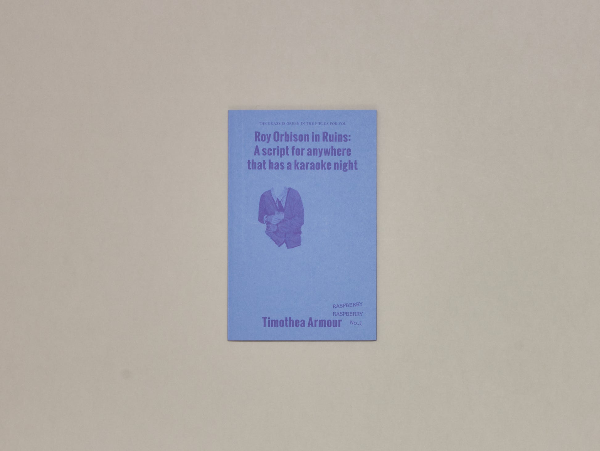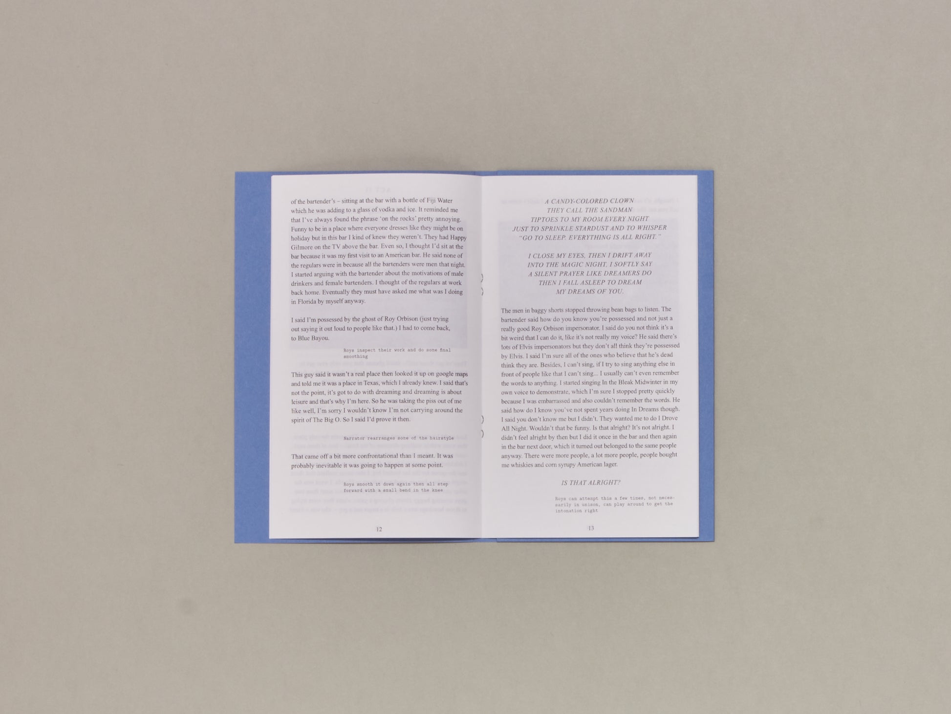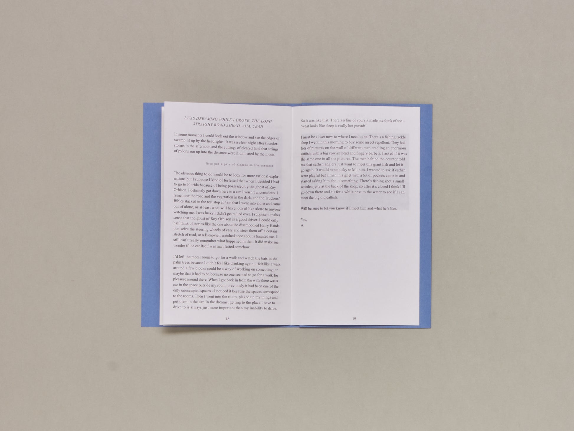 Roy Orbison in Ruins stages an imagined correspondence between a young hospitality worker on a road trip, and the musician David Berman. Unfolding over a series of four unanswered letters and karaoke interludes, we learn that our narrator has been possessed by the voice of Roy Orbison. Accompanied by her chorus of Roys, she slowly transforms into his image as she writes about dreaming, leisure time, haunting and ventriloquism from the rest stops, bars and motels of Florida.