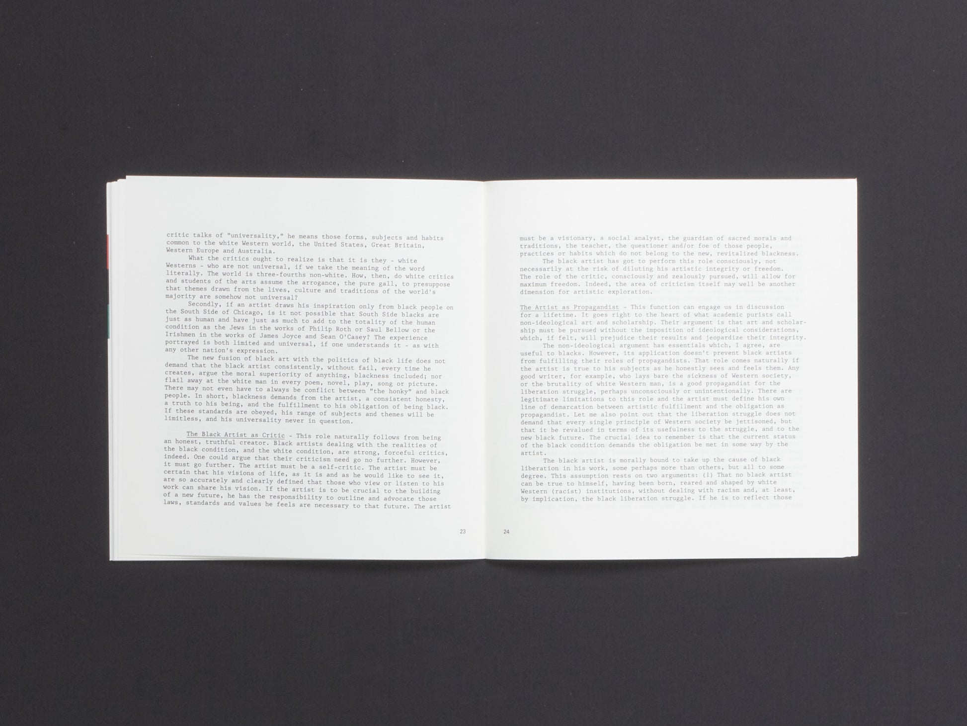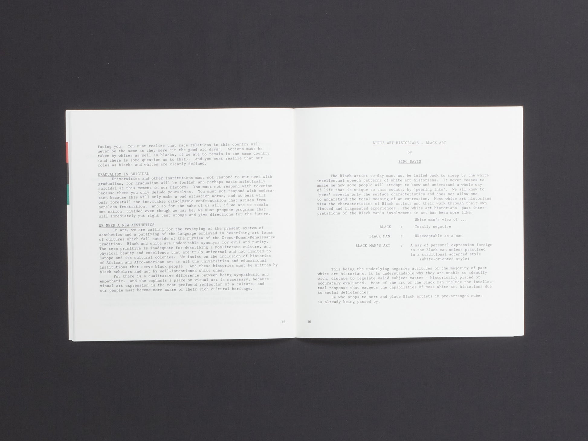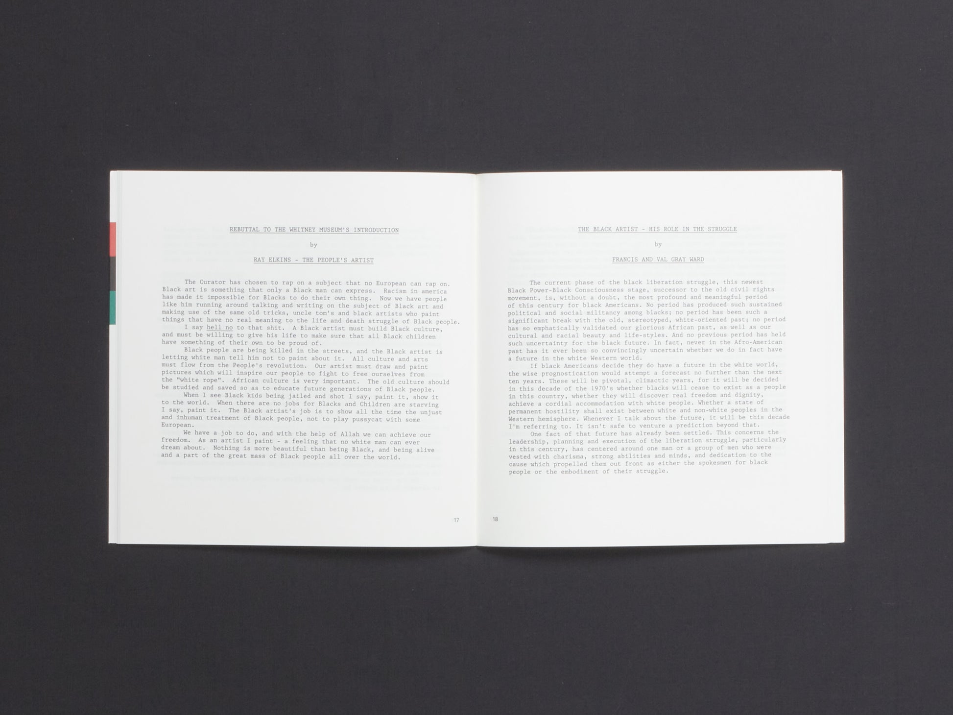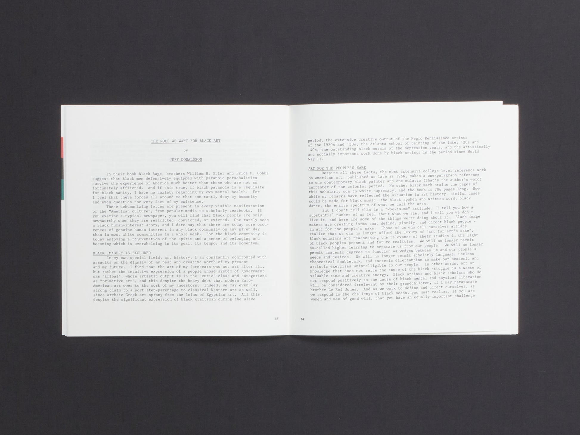 The artists featured in the publication position the Black Arts Movement outside of white, western frameworks, and articulate the movement as one created by and existing for Black people. Their essays condemn the attempts of museums and other white cultural institutions to tokenize, whitewash, and neutralize Black art, and call for immediate political and institutional reform and the self-determination of Black cultural producers. While the publication was created to respond to a particular historicized moment, the systemic problems that it addresses remain pervasive, making the artists’ potent critiques both timely and urgent.