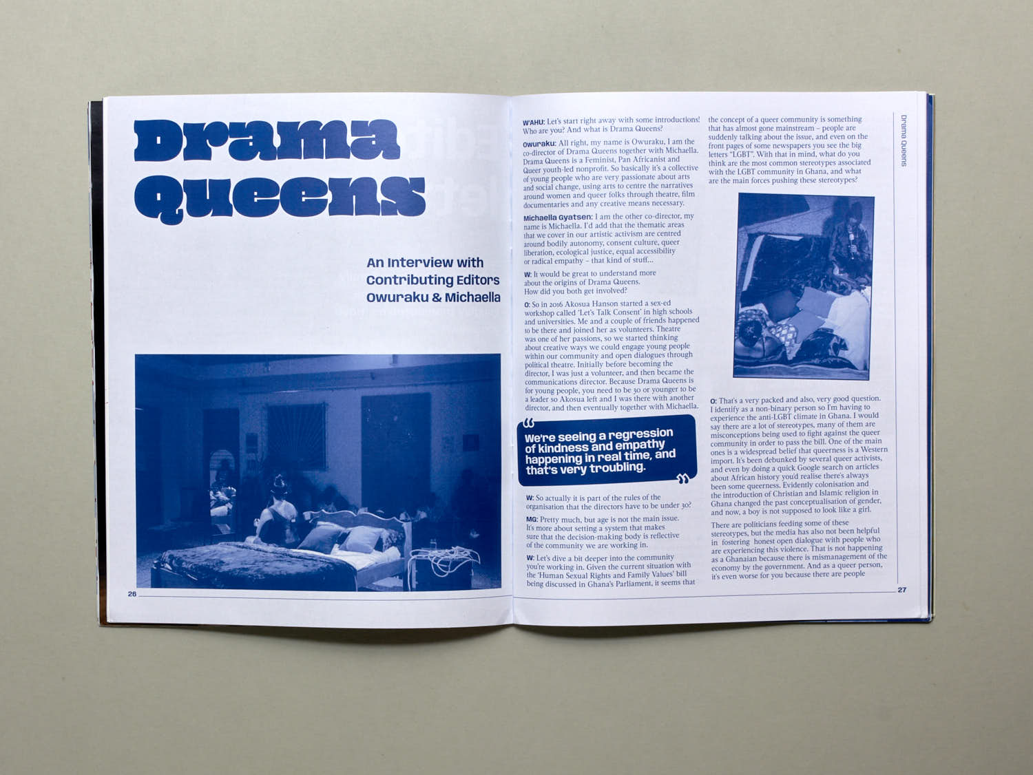 W’AHU Issue 1 is edited by Abraham Tettey, Efia Serwah, Colin Keays and Federico Martelli, with Drama Queens as contributing editors, designed by kxzx.studio. Featuring contributions from Joseph N.A Abbey Mensah, Nana Poley, Nyahan Tachie-Menson, and many more.