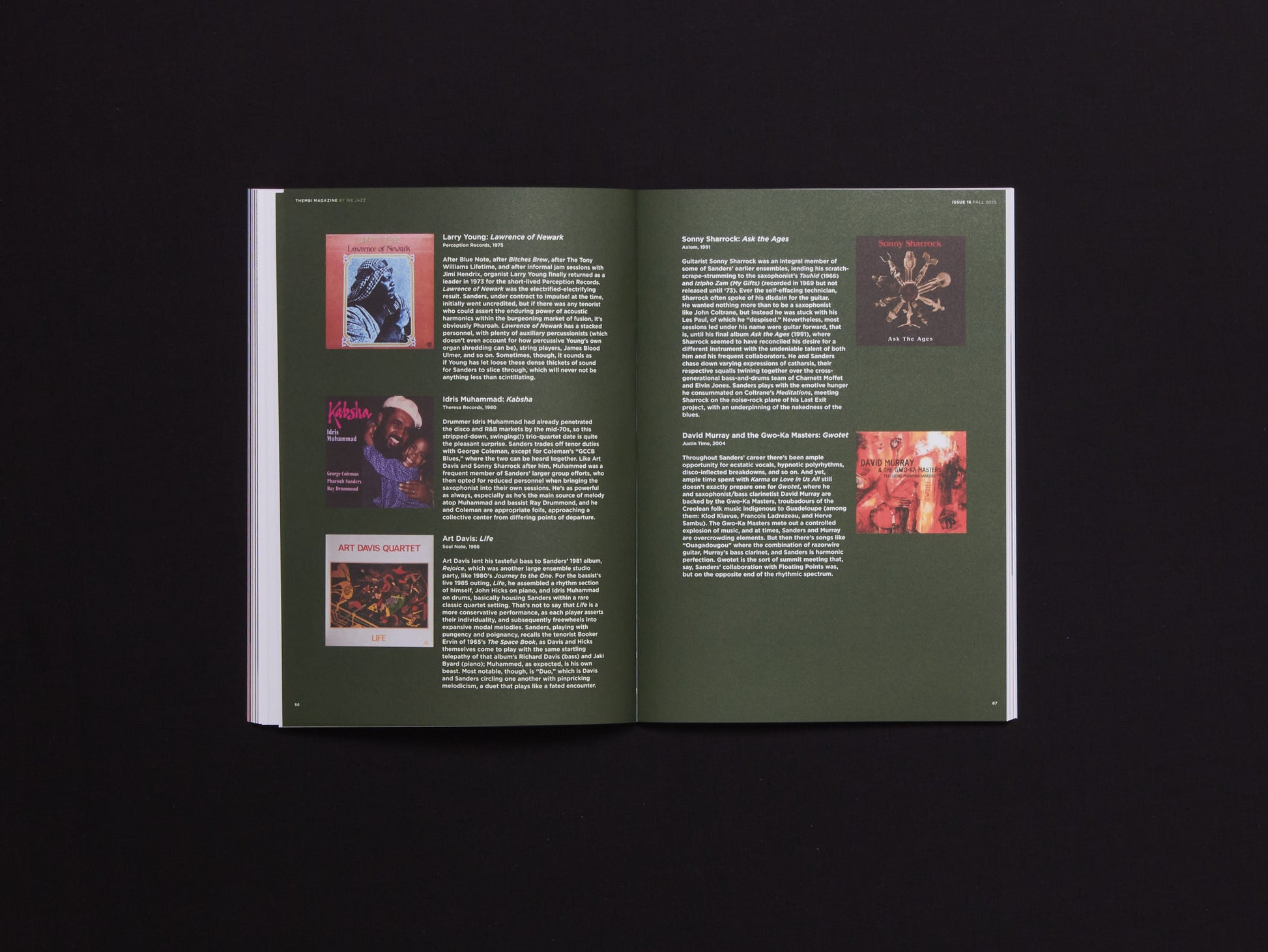 We Jazz Magazine, Issue 16 / Fall 2025 "Thembi" for Pharoah Sanders. All articles presented in English. 50 pages of Pharoah Sanders by Philip Arneill, Henry Boon, Pierre Crépon, Tony Higgins, Arsi Keva, Patrick Preziosi, Andy Thomas, Seymour Wright, Tomoki Sanders by Tej Adeleye, Don Cherry by Magnus Nygren, Sinsuke Fujieda by Rui Miguel Abreu, Jameszoo by Rob Garratt, Tony Purrone by Wolfgang Mowrey, Reco's Mini LP Covers, Discaholic column by Mats Gustafsson, album reviews, live reviews, photo essay & more. Front cover illustration by Nina Eggeman / JAW Family.