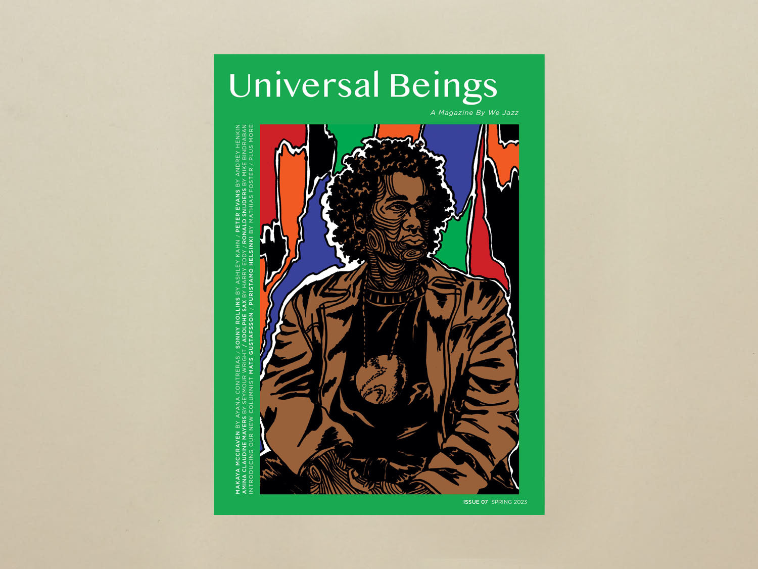 The seventh issue of We Jazz Magazine, "Universal Beings" for Makaya McCraven. 128 pages 174 x 240 mm in size and printed on 140g Edixion paper with laminated 300g Invercote covers. All articles presented IN ENGLISH. Stories include Makaya McCraven by Ayana Contreras, Sonny Rollins by Ashley Kahn, Amina Claudine Myers by Seymour Wright, Adolphe Sax by Harry Eddy, Ronald Snijders by Mike Bindraban, introducing our new columnist Mats Gustafsson, Puristamo Helsinki pressing plant photo essay by Mathias Foster, reviews, plus more.