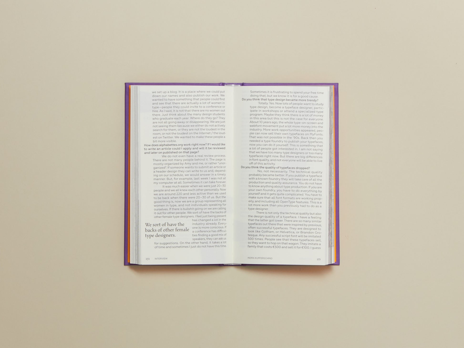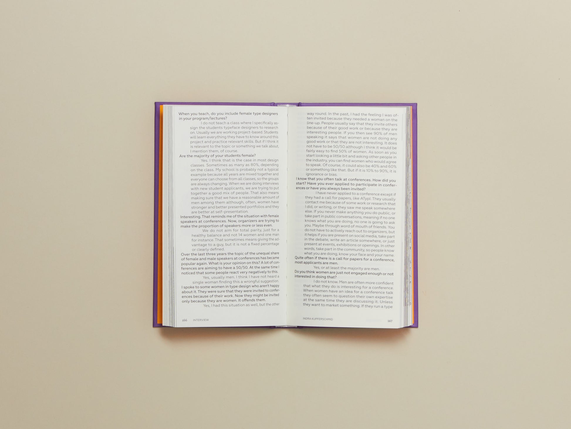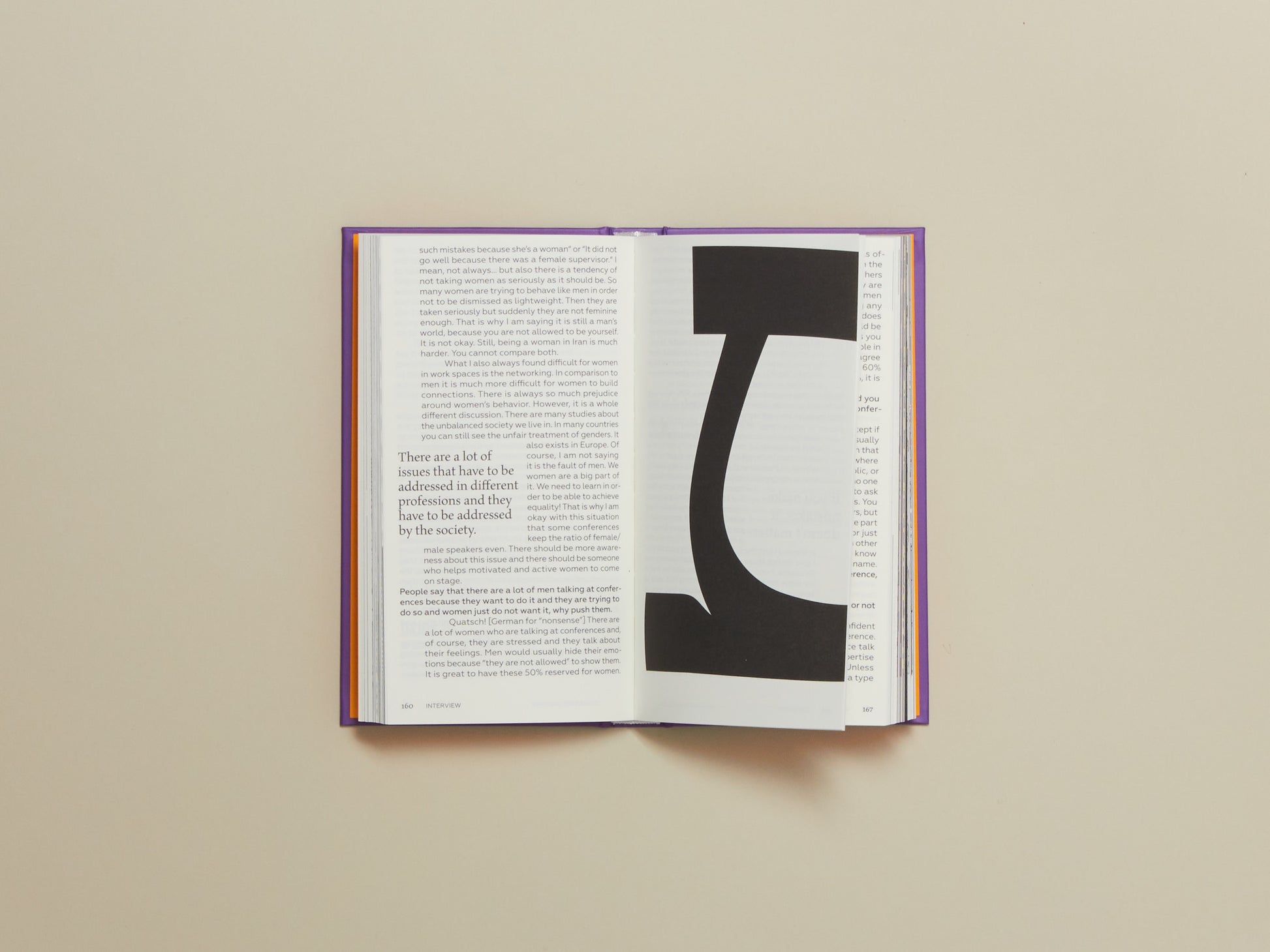 The second portion of the volume comprises a series of interviews with 14 women that are either currently working as type designers or are in other ways involved in the field of type design: Gayaneh Bagdasaryan, Veronika Burian, Maria Doreuli, Louise Fili, Martina Flor, Loraine Furter, Jenna Gesse, Golnar Kat Rahmani, Indra Kupferschmid, Briar Levit, Zuzana Licko, Ana Regidor, Fiona Ross and Carol Wahler.